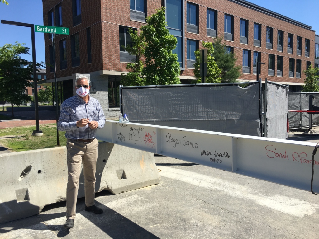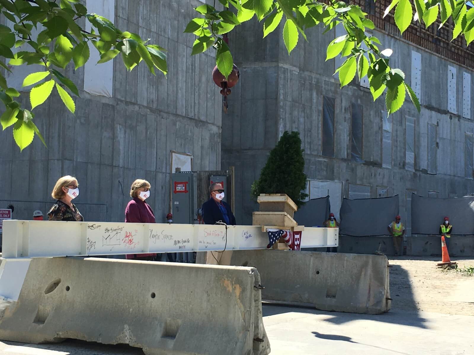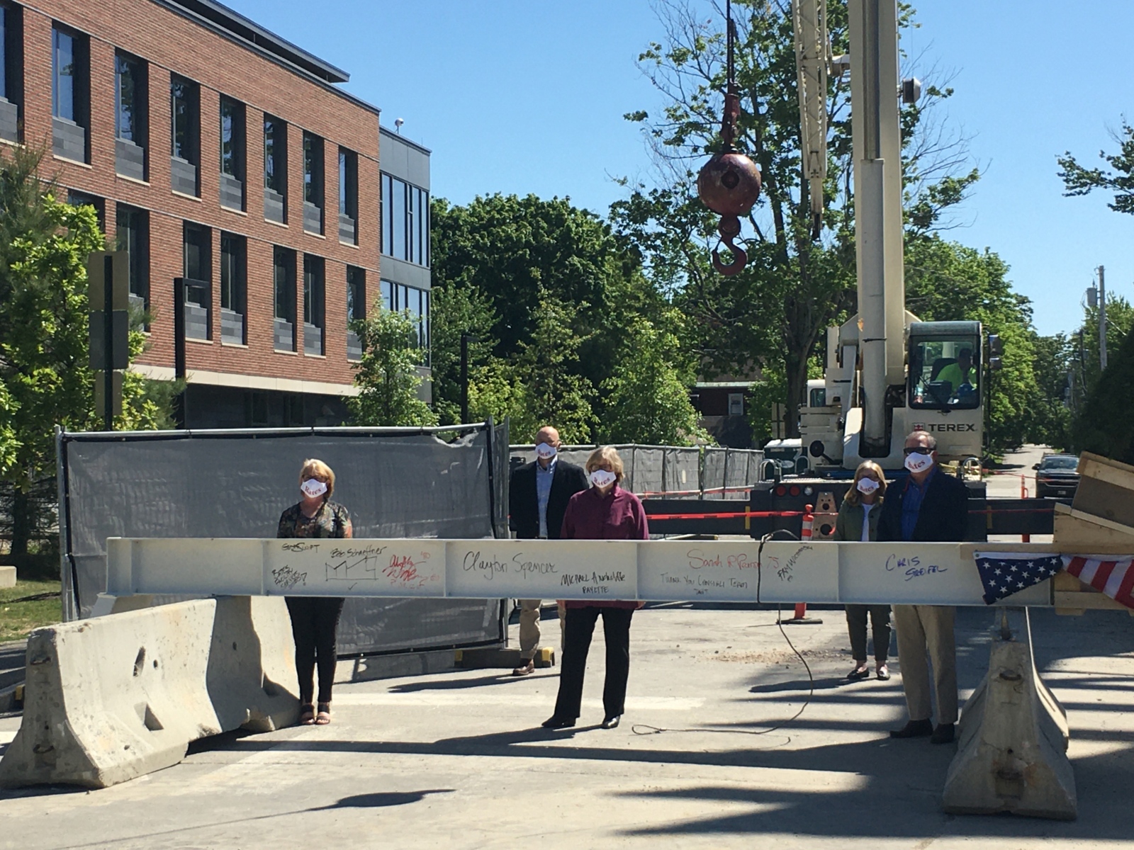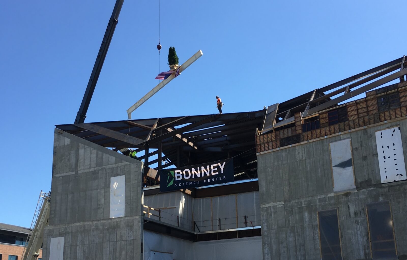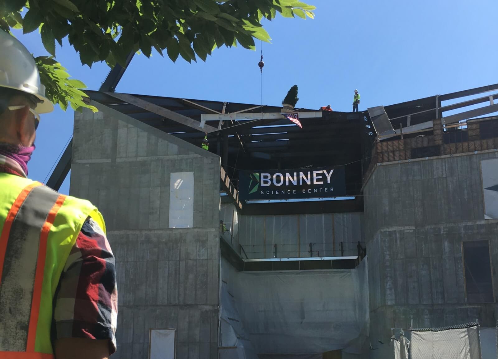 A beautiful summer day delivered the perfect backdrop for the topping off ceremony at the Bonney Science Center at Bates College. Topping off ceremonies are always exciting milestones. However, in this instance the symbolic tradition holds greater meaning as an optimistic marker for the future. Especially considering that promising scientific research is critical to help solve the current pandemic.