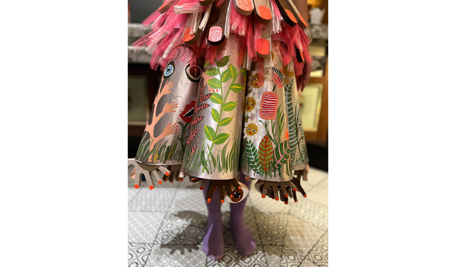 The collars and cuffs on one of the costumes was also made up of hands carved from acoustical PET. We also sculpted animals out of Sherwin Williams spackle and planted them in the headpieces. Our motto was “the weirder the better!” Our imagination stretched to the shoes as well, which we used Sherwin Williams spackle to create a mouth with a tongue sticking out for one pair of shoes, and the other pair looked like human feet.