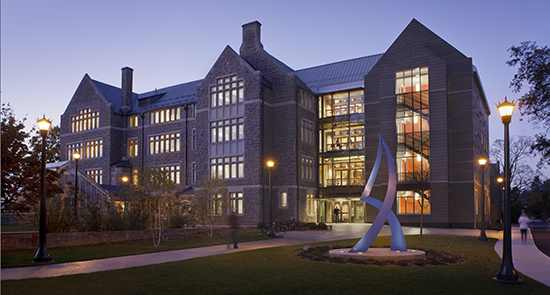 The original building, the College’s first campus building in 1914, is a four-story Collegiate Gothic style building featuring a granite exterior. As the teaching labs and research labs had fallen into disrepair, the new addition and renovation provided an extraordinary opportunity to revitalize the historical features of the building, such as clerestory windows and open ceilings, while creating a modern science building.