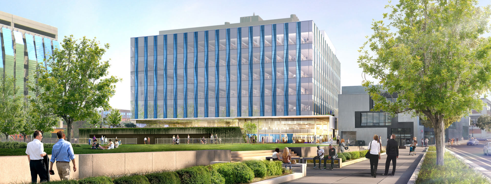 The 105 by Breakthrough inherited a zoning agreement with the City of Boston to incorporate a public way that would bypass the city block. The team refined this idea in the design with a clear, single volume expression, working the changing grades through a series of stairs and slopes that seamlessly take pedestrians across the ground level of the building. This bypass spills into other public spaces at this level than can be used by anyone in the community. Currently under construction, this bypass is beginning to take shape and reveal its scale. The way the canopy and roof fold and bracket the pass through successfully resolves the connection without abutting or turning its back to its direct neighbors.
