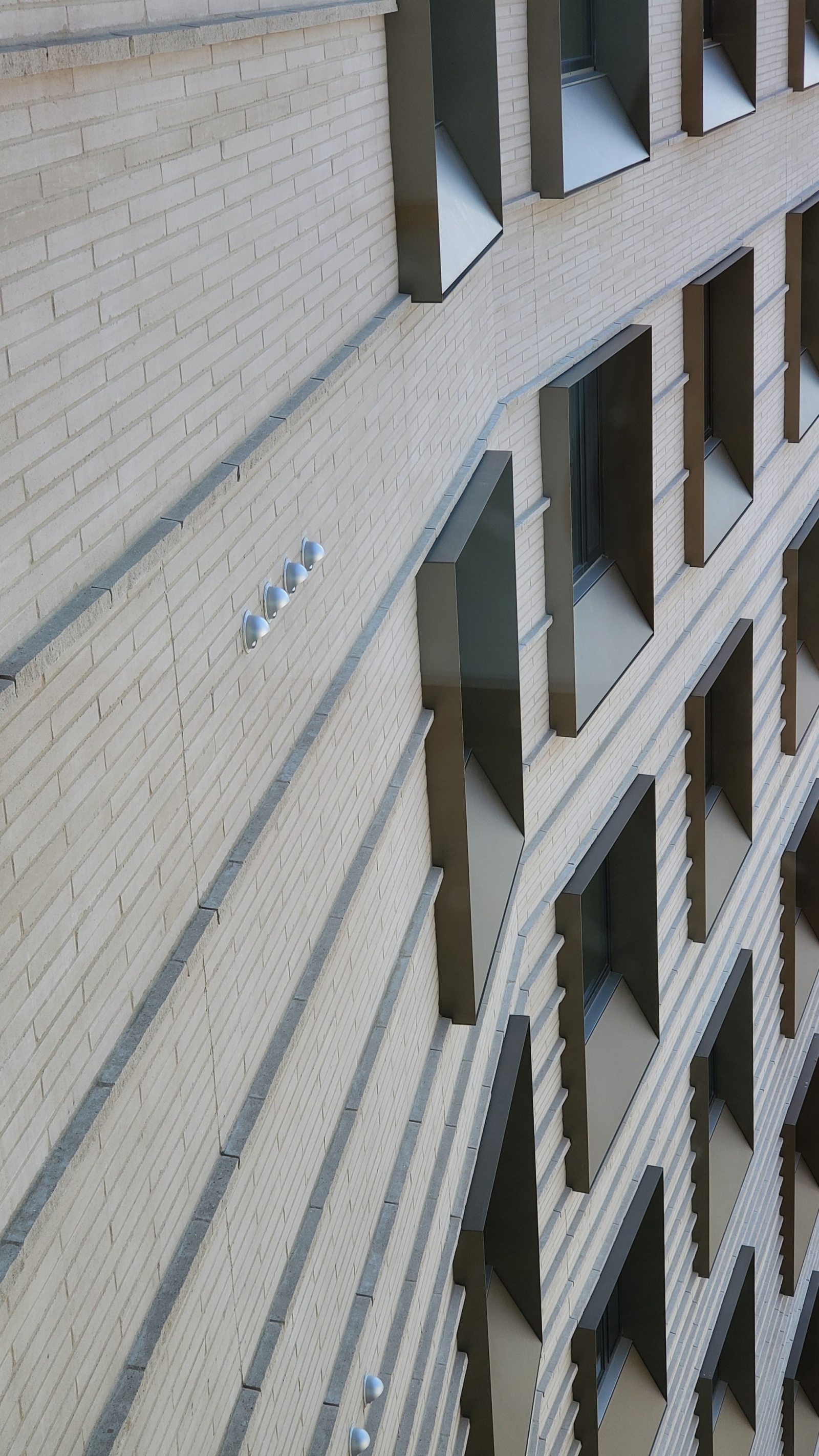 The masonry façade is selectively interrupted with glazing at important inflection points, defining communal spaces.