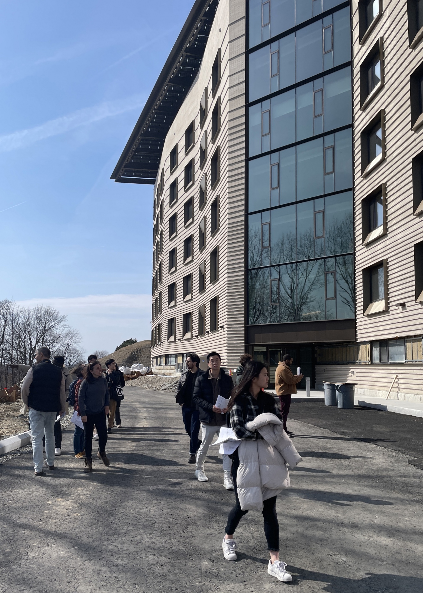 On a clear, early spring day, I joined a tour organized by the Young Designers Core of the nearly finished Veterans’ Home in Chelsea. While the grounds aren’t yet complete, the building’s relationship to its context is clearly manifest. The building, tucked between its soon-to be demolished predecessor and Malone Park, seems at once atop Powder Horn Hill and within the Chelsea community. Its location affords both panoramic vistas of Boston and framed views to the residential fabric that immediately surrounds it.