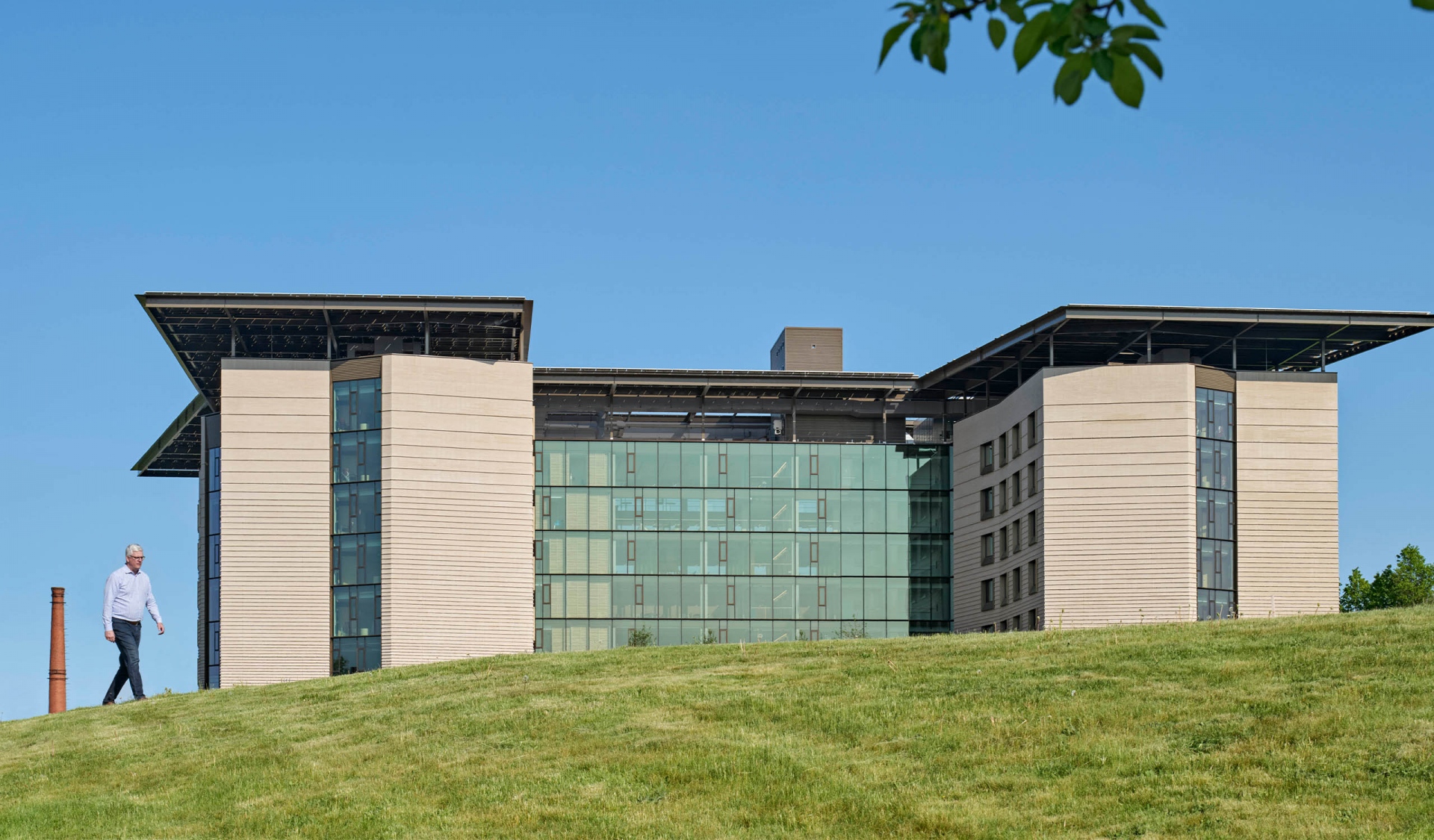 The H-shaped floor plan creates four distinct wings, allowing inhabitants to orient themselves within the building. It provides for views across to other wings, allowing one to appreciate the façades and iconic photovoltaic (PV) canopy along with the expansive views. At the center of the H is the Great Room, where the building is both thin and transparent. The Great Room acts as a junction between two significant outdoor spaces. This relationship welcomes the community to approach the building, fills the great room with light and invites observation of the outdoor spaces from within.