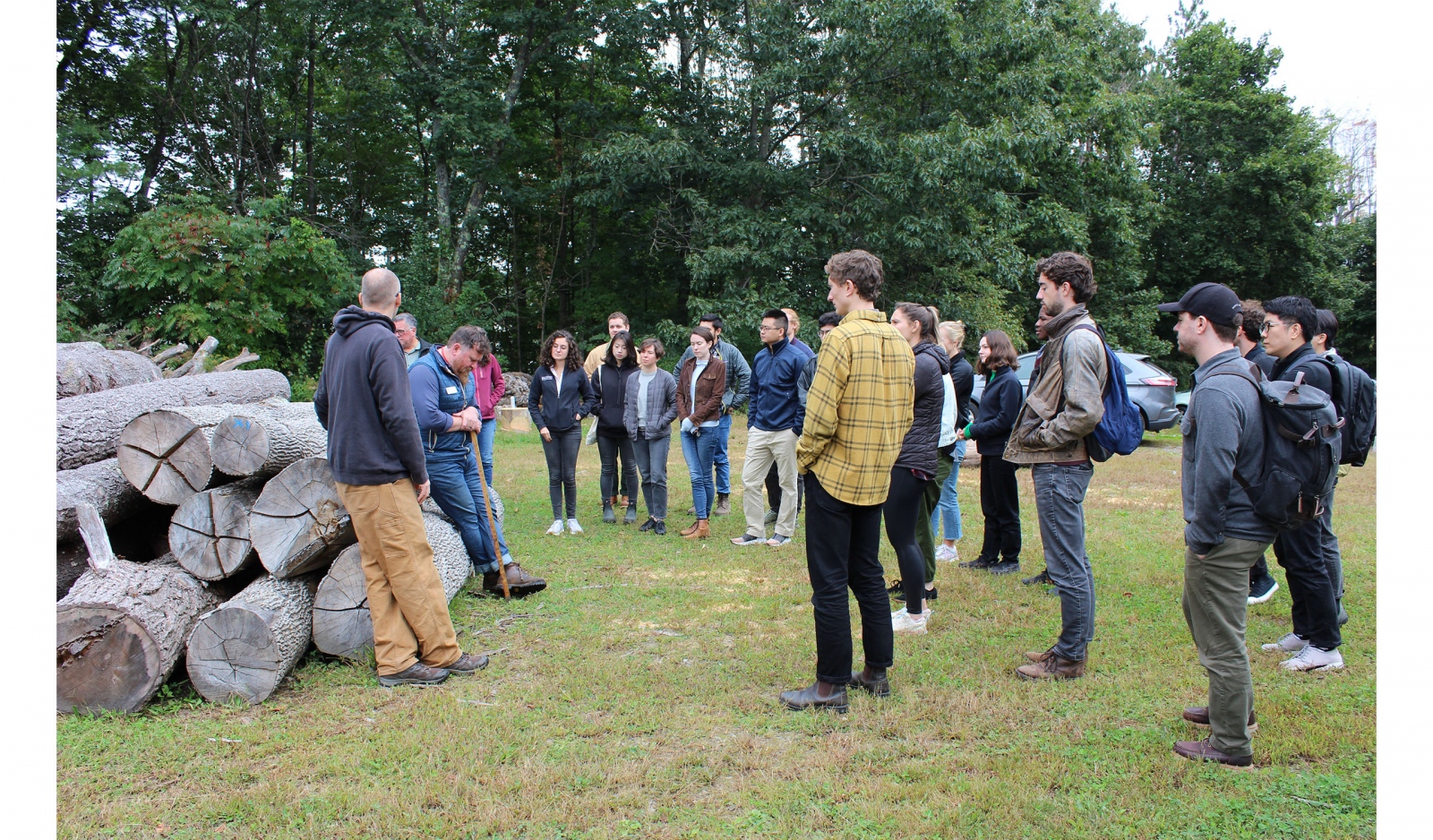 A group of PAYETTE people recently traveled to New Hampshire to learn more about sustainable forestry and its ramifications for the architecture industry. We are increasingly paying attention to embodied carbon – the carbon emissions associated with building materials. Bio-based materials like wood show tremendous potential to reduce and even offset the embodied carbon footprint of buildings, particularly when used in large quantities. Mass timber is one example. A building’s structure represents 40-60% of the footprint of a building. Substituting mass timber in place of steel and concrete can make a significant impact. Within PAYETTE, projects are leveraging the embodied carbon reductions from bio-based materials in different ways. Among others, the Land’s Sake Farm (nearing construction completion) is framed with heavy timber. The UMass Amherst Sustainable Engineering Laboratory (at the end of Schematic Design) is pursuing a steel-timber hybrid structure, and most of the team joined the tour to learn more.