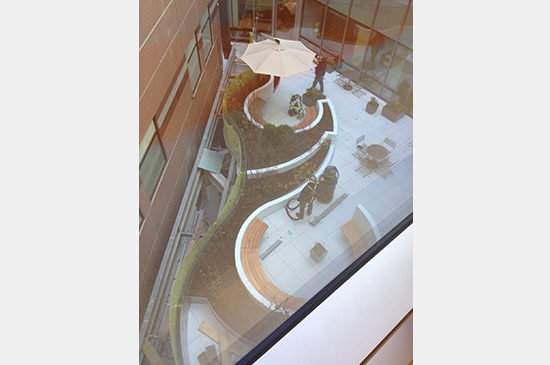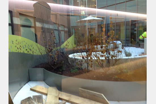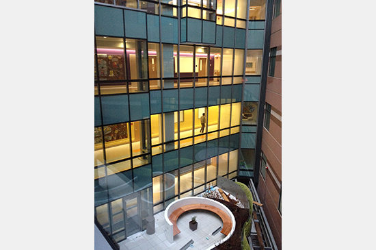 The building is an infill building with prominent street frontages along Binney Street and the main drop-off for the hospital. At this recent shoot we focused on capturing the interiors. Walking through a building with both the architects and the photographer, Warren Jagger, I learned a lot about the space – from the detailing to what elements Warren hoped to capture. Prior to taking any photos we visited each floor to assess which would provide the best light and variety – from the patient rooms to the nurse’s stations to views of the courtyard. Though in an urban setting, the design incorporated landscape elements with a courtyard located where the addition meets the existing building. The courtyard provides natural light to the existing adjacent hospital beds and the addition. This green oasis is the only visually and physically accessible landscape feature contiguous to the hospital corridor system.