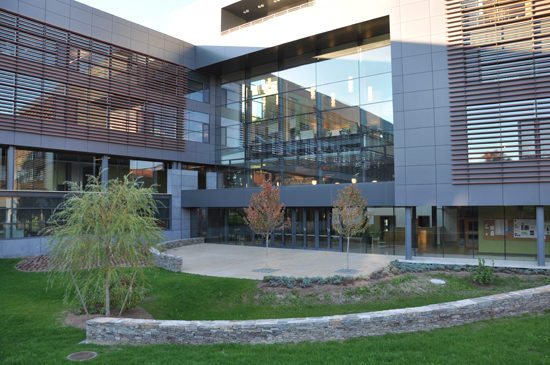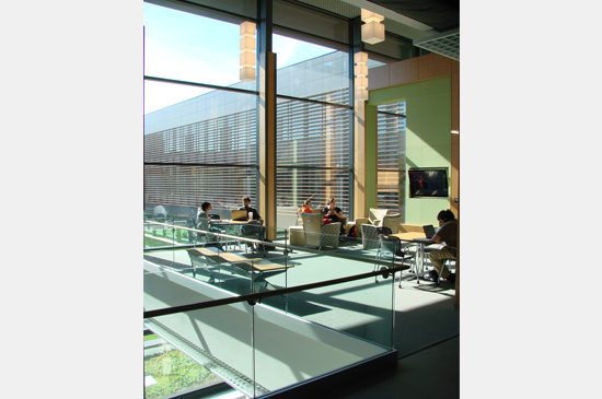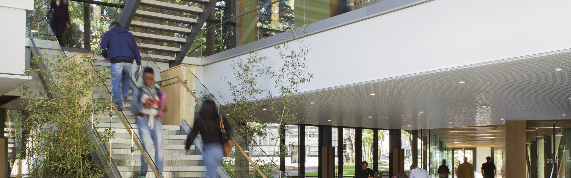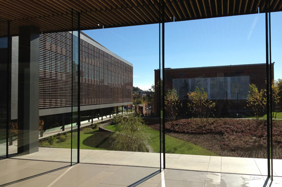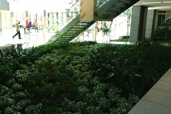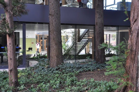 In the main atrium the area under the main staircase has a garden feature that makes it feel like you are outside, while still inside. The indoor garden connects visually to the outdoor garden through the floor to ceiling windows and to the greenhouse beyond, much like how the different façade materials relate to the surroundings on each side of the building.