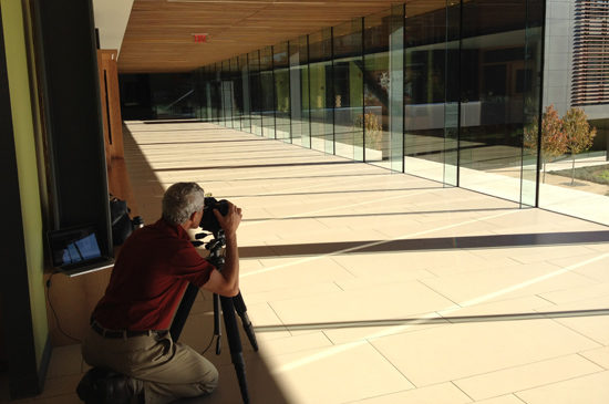 Warren Jagger photographed the building last fall and again this year, working to capture all the details of the building – big and small. We worked our way through the building; capturing first one corridor and then the next, waiting for students to change classes and populate the building. I’d never been involved with an architecture photo shoot before and I observed how involved the staging of the shots are; no detail was overlooked. We moved trash cans aside, set chairs straight and tidied wayward posters tacked to bulletin boards. All these small details ensure nothing distracts from the focus of the photograph. Warren explained to me why he takes so many seemingly similar photos in order to best represent the building. We also discussed which shots would look best at dusk and which shots should wait until early the next morning.