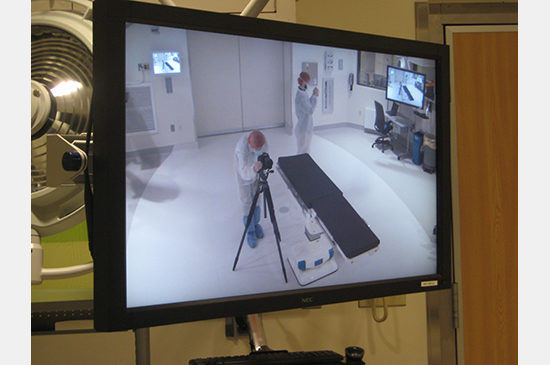 Last week during the photo shoot, it was the first time that the PAYETTE team had seen the overhead MRI and CT in action. The entire team and equipment had to “scrub in” before entering the surgical suite, which included brushing each finger on all four sides 30 times each. In addition to still images, our photographer Warren Jagger also augmented the photo shoot with a short video of the two pieces of equipment being deployed into the operating room. Today we’ve included a preview video taken by Wes Schwartz with his iPhone.