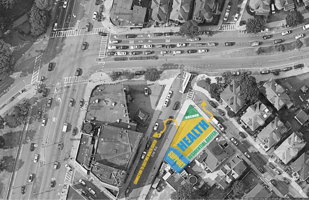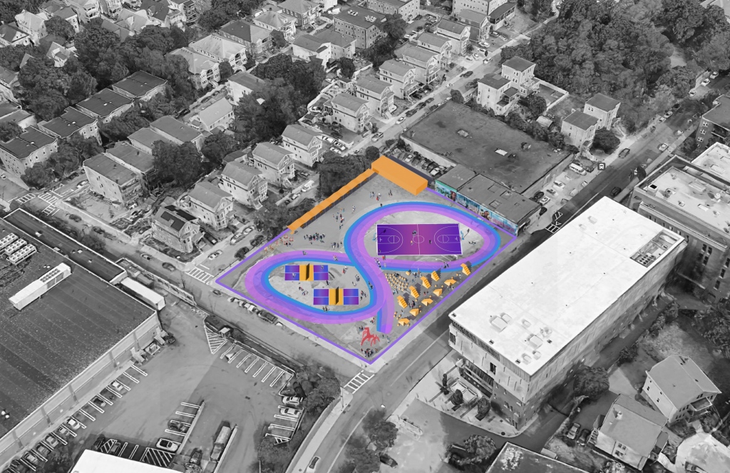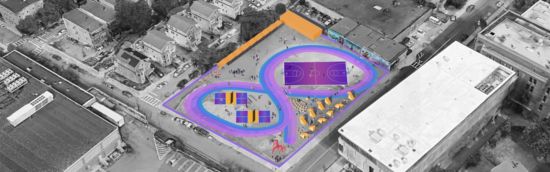 A large site in the middle of a residential quarter and across the street from a neighborhood library, the site at 48 Geneva Road is already scheduled for future construction of a youth center. The team decided to address the immediate, short term impacts that could be achieved on this large, vacant site. Noting other successful pop-up markets and experiences in the greater Boston area, a flexible pavilion and mixed market and sports park was conceptualized. Activation could be achieved through projected movies, basketball and pickleball courts, flexibly arranged outdoor seating as well as an infinity-shaped bicycle and walking track which could be overlaid with market stalls on weekends or special occasions.