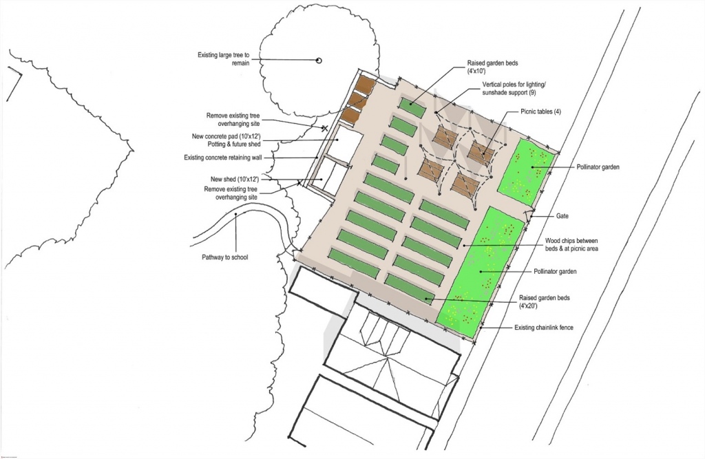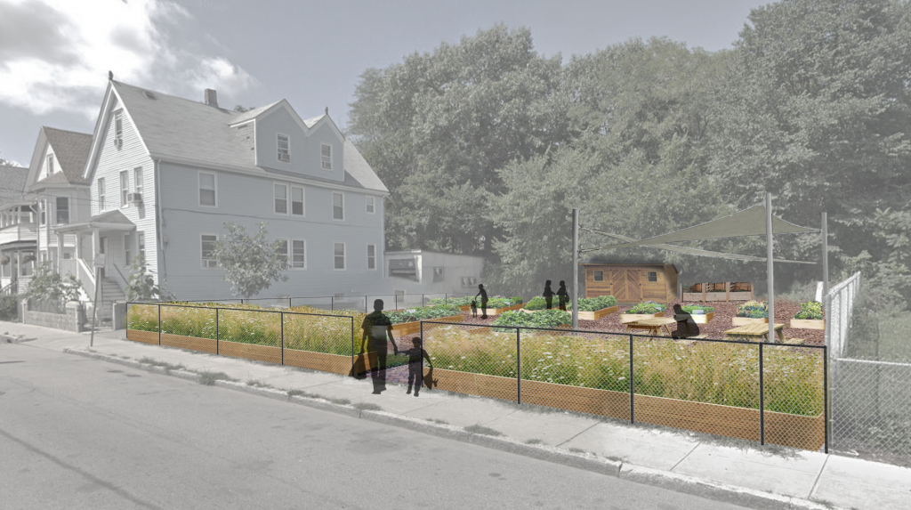 Located the furthest from Blue Hill Avenue, yet adjacent to a school and down the street from a new outdoor ballfields and sports complex, the site at 53 Ceylon Street is the smallest and most “out of the way” site evaluated with greatest residential context. For this reason, a community garden with raised garden beds and filled with community assets is proposed. These may include tables and picnic areas, mural and art, as well as pollinator gardens.