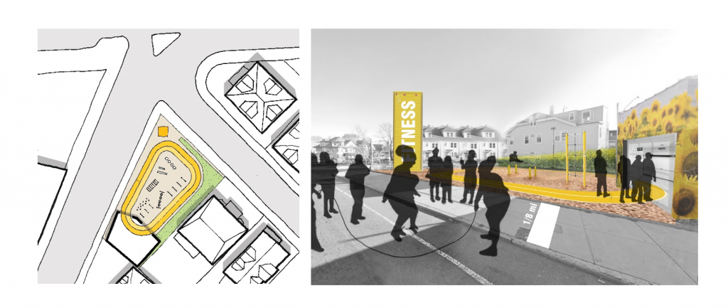The first site explored is a smaller lot located at 8 Old Road, just one block off of Blue Hill Avenue and only a few blocks from the Franklin Park Zoo. Mr. Gaskin noted that there are plans for a neighborhood health center on the same block, and that there is opportunity for programming the lot to support the new community asset. The team looked at concepts which both encourage public health and fitness as well as providing public art or a visual anchor towards Blue Hill Avenue. It became apparent that a small, vegetated border was desired to establish a boundary to the residential area to the southeast. Mixing landscape, fitness and art, the design team developed a concept for a track with calisthenics equipment that can serve as a meeting space, free outdoor gym or queue space for public health initiatives like blood drives, vaccinations or other health events or fairs.