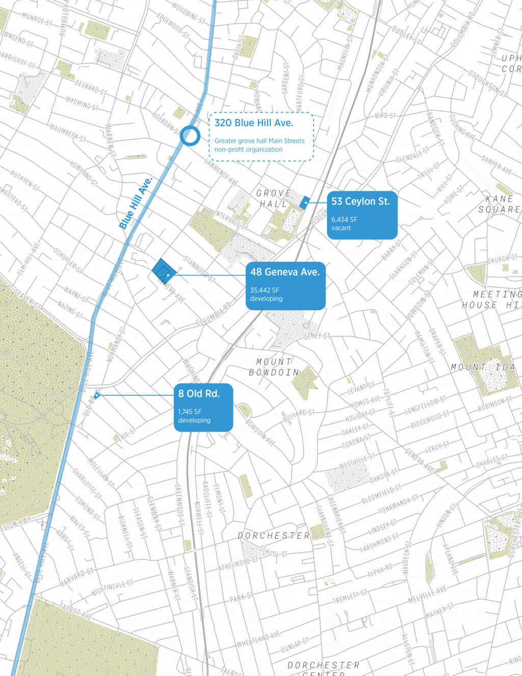 Initial explorations began with a walk around Grove Hall with Mr. Gaskin to better understand recent projects by GGHMS, neighborhood context and to visit several specific lots of interest for designing an intervention. The site walk enabled the team to prepare for an all-day, in-house. What emerged was a categorization based on lot size, expected pedestrian activity and commercial versus residential character. Precedent projects were further gauged based on expected installation duration, cost and complexity, maintenance, level of infrastructure, on-site utilities required and level of community engagement.