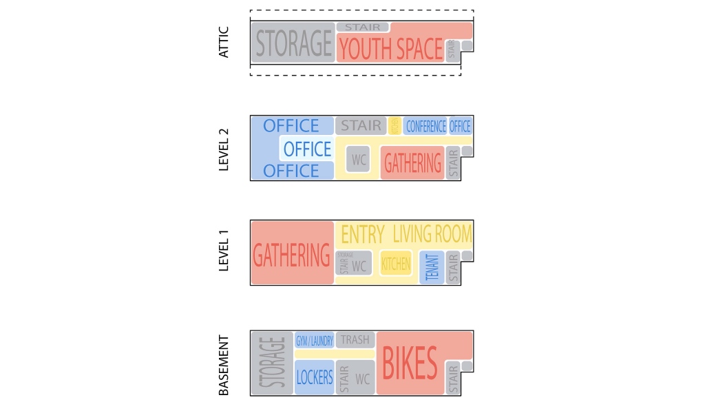 The existing building is a former lumber mill with rich character and is an important piece of local history. The design leverages the trusses and framing of the existing structure to bring a beautiful and unique texture to the new spaces. The long spans of the old mill floors lend themselves to new open, flexible programs. The existing boarded-up window openings can be restored at the scale of the original windows, providing ample southern light along the length of the building. The strategic reintroduction of new windows and skylights will provide ample natural light. Support program, storage and vertical circulation will be concentrated in the center of the plan, free of the perimeter walls to provide an overall division of space without relying too heavily on framed partitions. Various programs can be configured, packed away and reconfigured around the core elements.