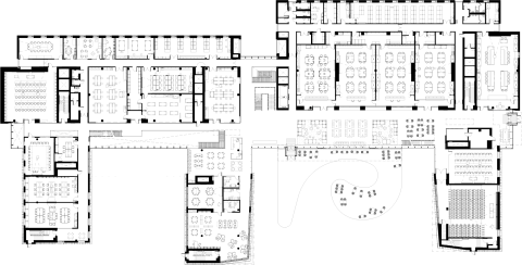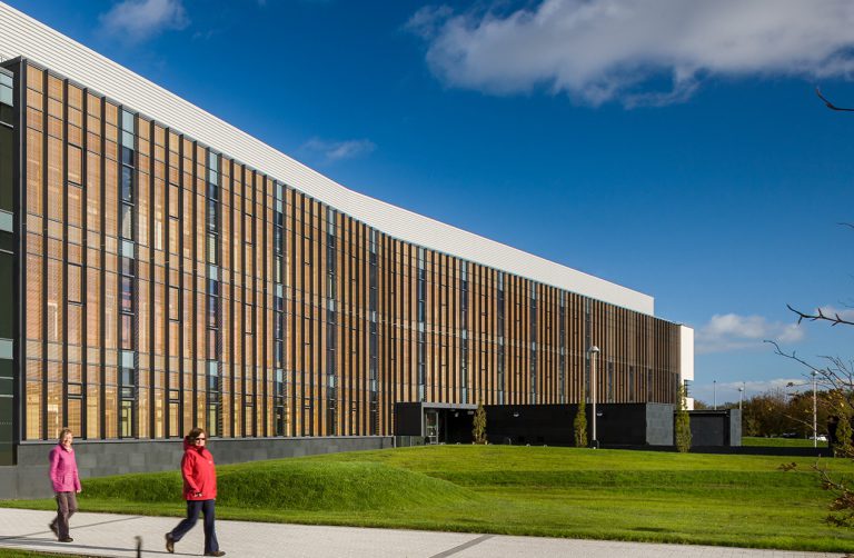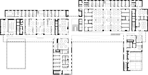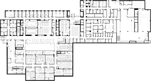 The distinctive roof, covering the multi-story, glass-enclosed commons, is the building’s primary unifying feature. Finely crafted skylights run the length of the building, animating the roof form and enhancing the quality of daylight within. The roof performs many functions simultaneously. It provides both natural and artificial light, its photovoltaic panels generate electricity, its shape and materials afford acoustic control, and it radiantly heats and cools the commons.