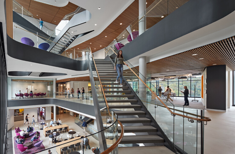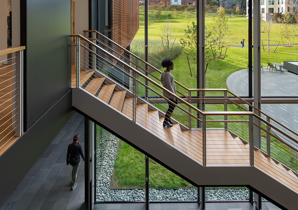 From overall organization to detailing, the design promotes transparency and interaction. Most of the activity in the Science Center is visible to the College through the glass walls of the commons. The spaces within enjoy powerful views back to the campus and intimate visual connections to one another. Research and teaching laboratories are structured to support both subject-based foundational instruction and interdisciplinary exploration, while classrooms are adapted to new pedagogies and active learning, to serve students from across the campus. A network of community spaces at various scales strengthens the close student-to-student and student-to-faculty relationships that are the hallmark of Amherst’s science education.