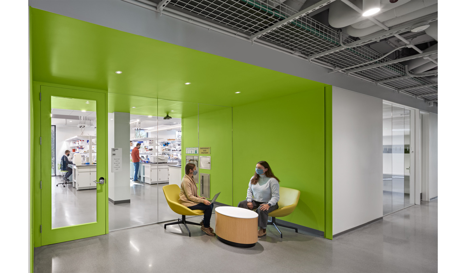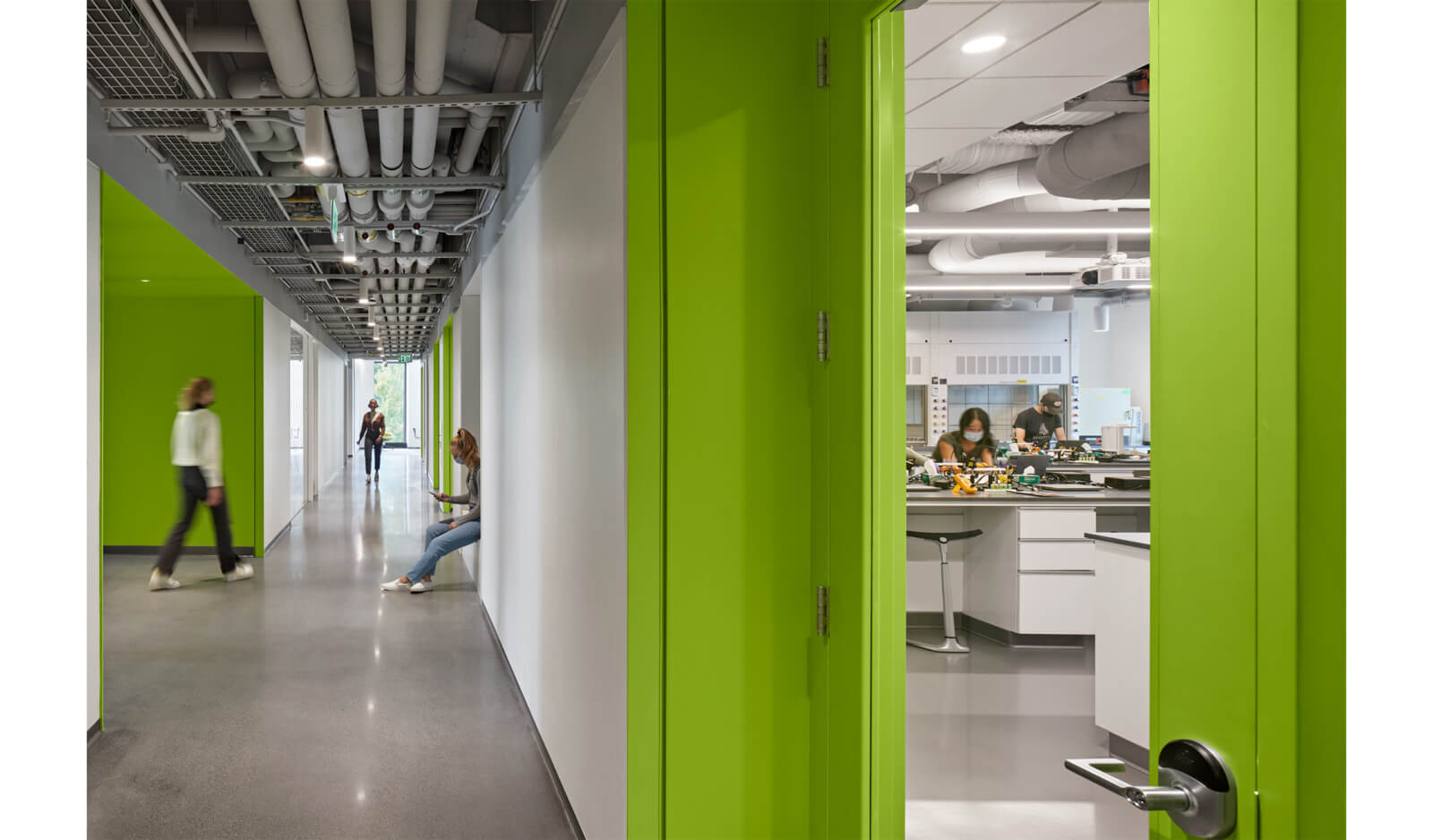 Being the first academic building south of Campus Avenue, the Bonney Science Center employs large windows at key spaces to be visibly connected to the historic campus core. A two story study lounge and a variety of student collaboration spaces welcome the entire Bates community to the sciences. A simple, single corridor on each floor maintains a sense of intimacy and collegiality while the dramatic central stair creates a focal point for the entire building.