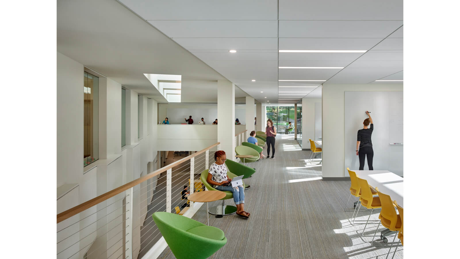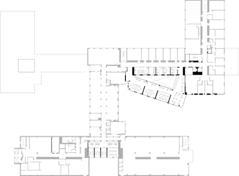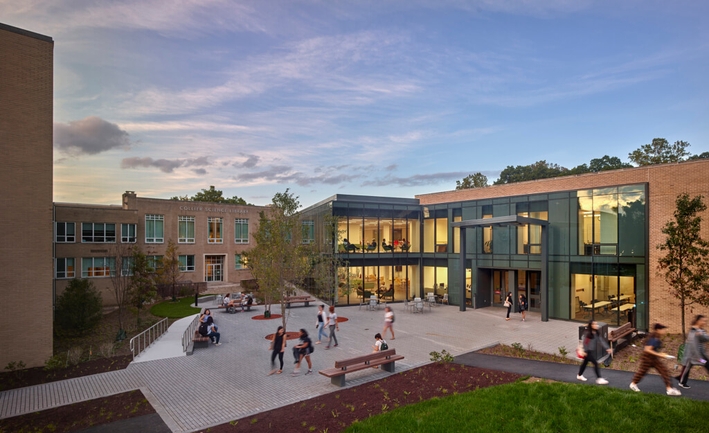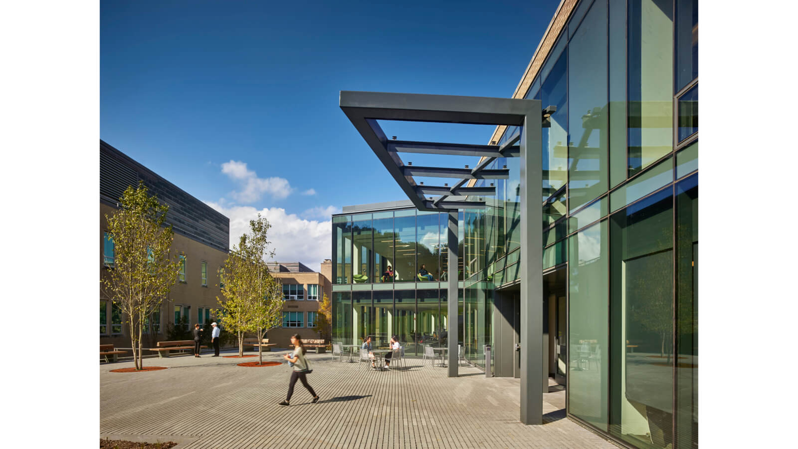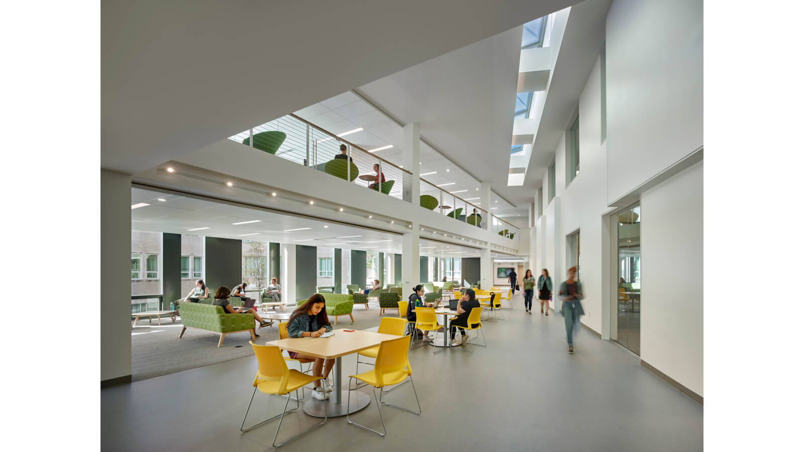 The project is centered on a three story, glass addition facing the complex’s underutilized main courtyard. Modest in size but dynamic in its effect, the addition weaves new spaces for active student learning into the building’s existing fabric. Its double-height commons opens off the entry and leads to the Science Crossroads, where the building’s many wings come together. The project introduces a new language of transparency and daylight into corridors that extend from it, offering views of the activities in labs and classrooms and fostering connections between the building’s many occupants.