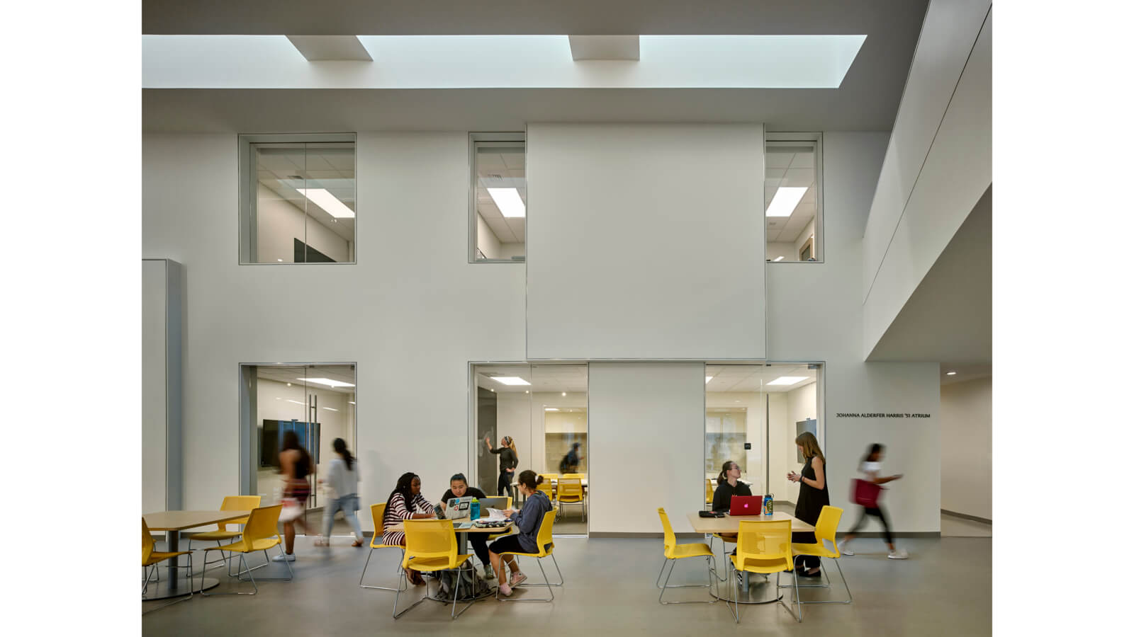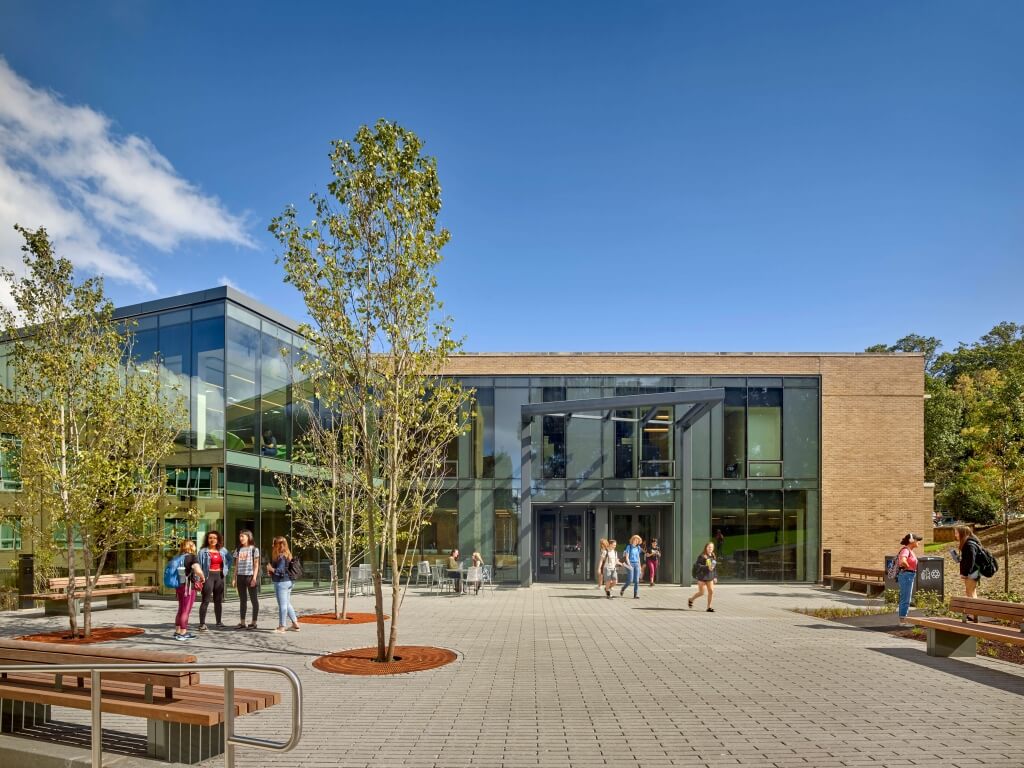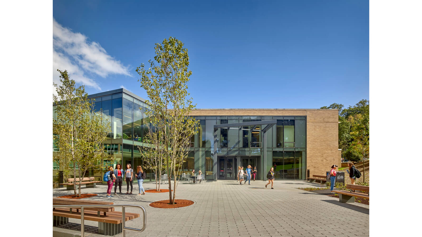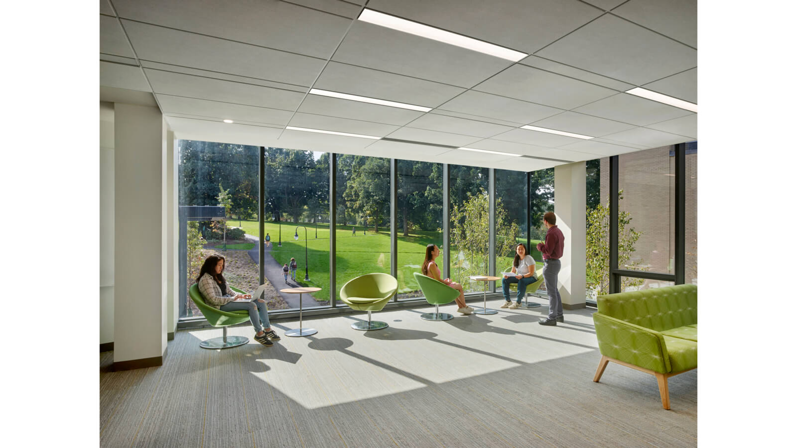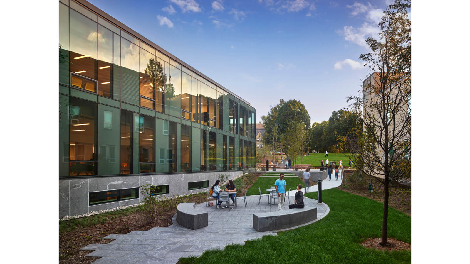 The addition also helps frame two new campus spaces. A paved entry plaza with a glass canopy provides a new arrival point and public gathering space, significantly improving the approach from Merion Green, the iconic venue for reunions, May Day celebrations and convocation. Just a few steps beyond the entry, an intimate sunken garden offers respite and repose.