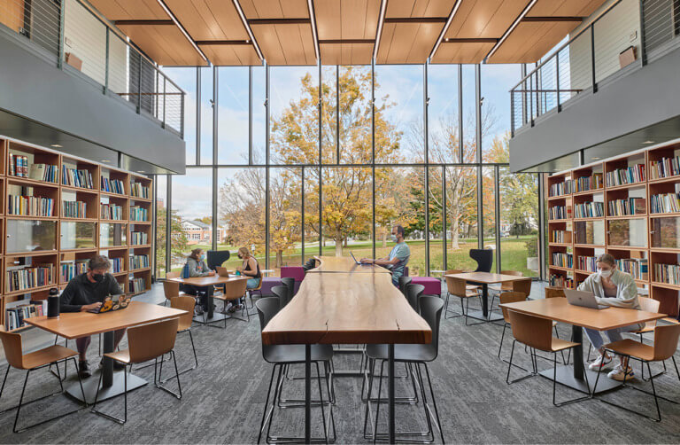 The building is integrated into the existing campus fabric with low-maintenance native species. The siting of the building creates new outdoor spaces that are right-sized and have unique characters. Natural materials and local species are employed to weave the new landscapes with the existing scrub pines and oaks that have shaded the campus quad for decades. Meadow grasses cover over half of the site and is an important habitat.