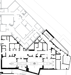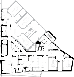 The massing and form of the addition were derived from its function. The overlay of magnetic field patterns, as defined by the hospital’s physicists, pinpointed areas where the new MRIs could be located. These positions introduced an unexpected geometry, shaping the project’s relationship to its site and the organization of the CSI’s two programs: the inter-operative research expansion on level 2, which includes the hybrid OR and support space for human and animal research; and the expansion of the Imaging Pavilion on level 3, which houses two additional MRI rooms, new patient reception and waiting space and support space for the imaging department.