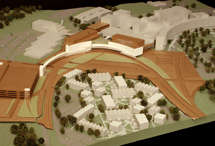 A sweeping form known as the Arc, inspired by the Medical Center’s iconic Crescent, reorients the institution, shifting its center of gravity to the east and centering growth on a new campus green. The Arc sets the geometry of pedestrian and vehicular traffic, landscape and infrastructure. From it, a series of gardens extends into the hospital complex, embedding nature alongside treatment spaces to promote healing. Green roofs are gardens for patients and staff.