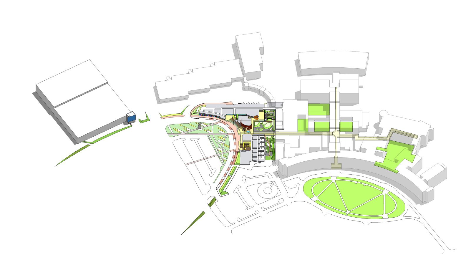 In the relationships between the buildings and the environment, the plan integrates healing and sustainability. Spaces between buildings admit natural light and air, which are managed to enhance patient well-being and building energy performance, simultaneously.