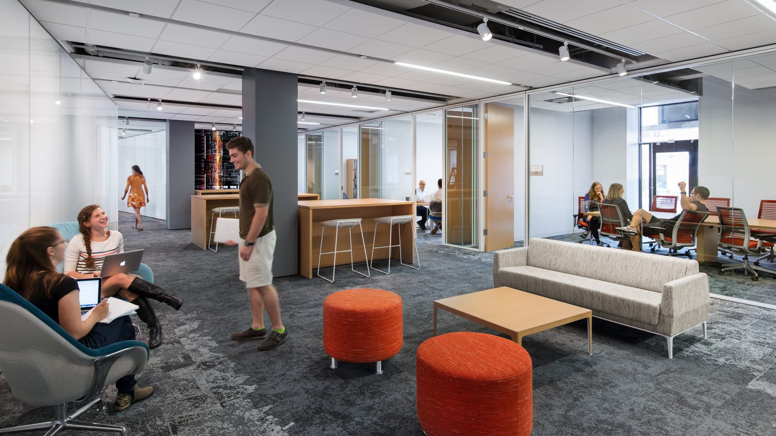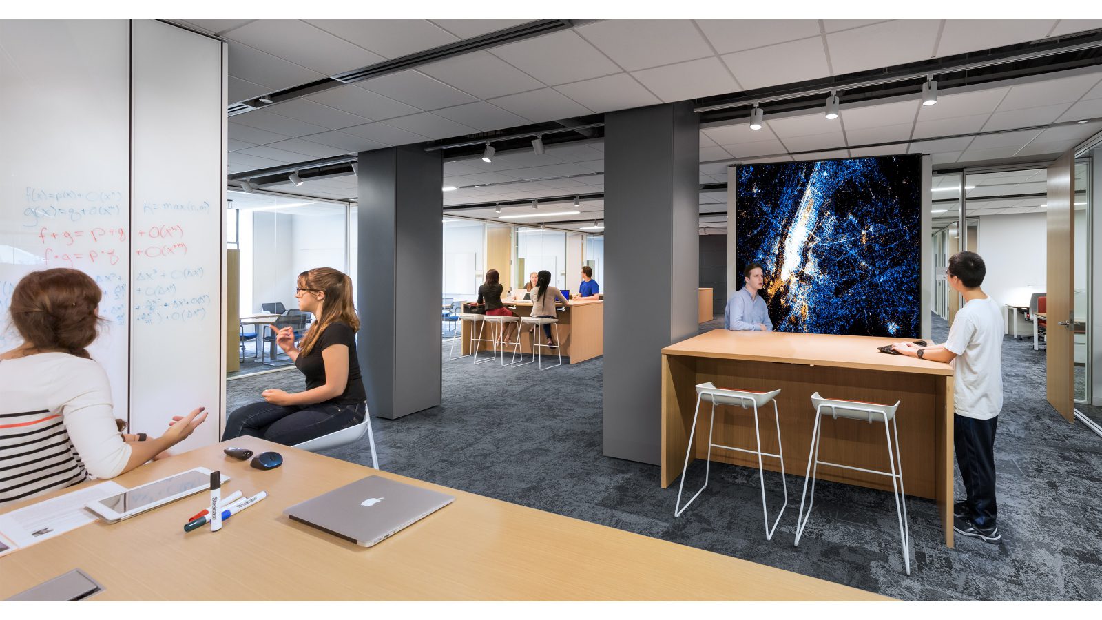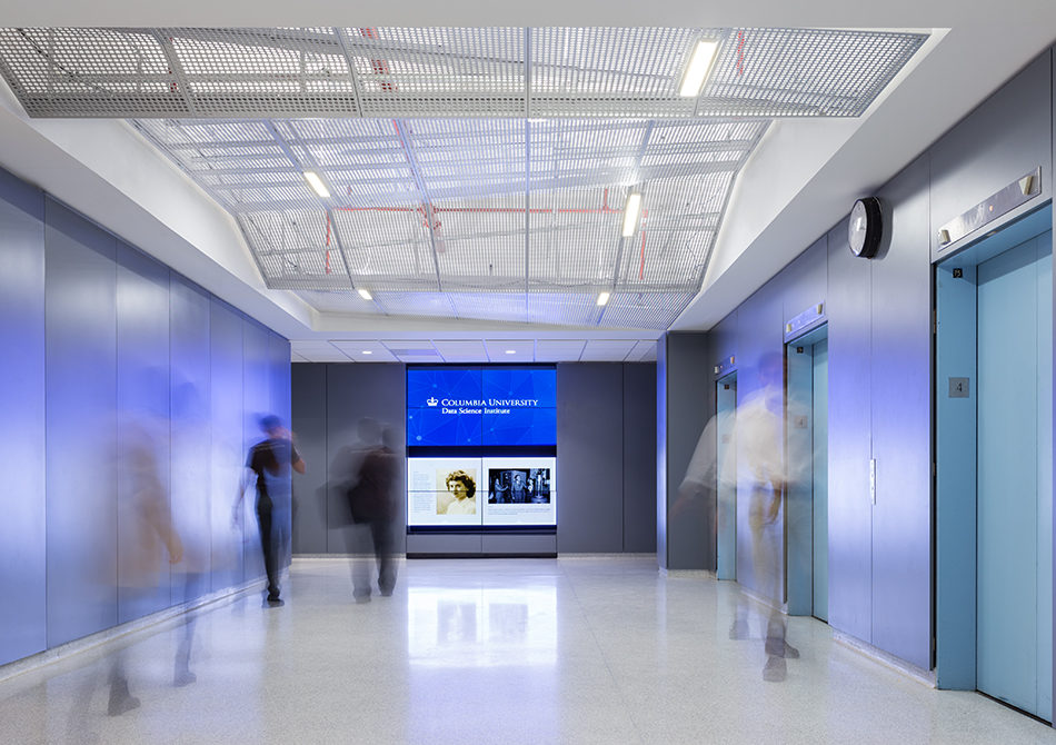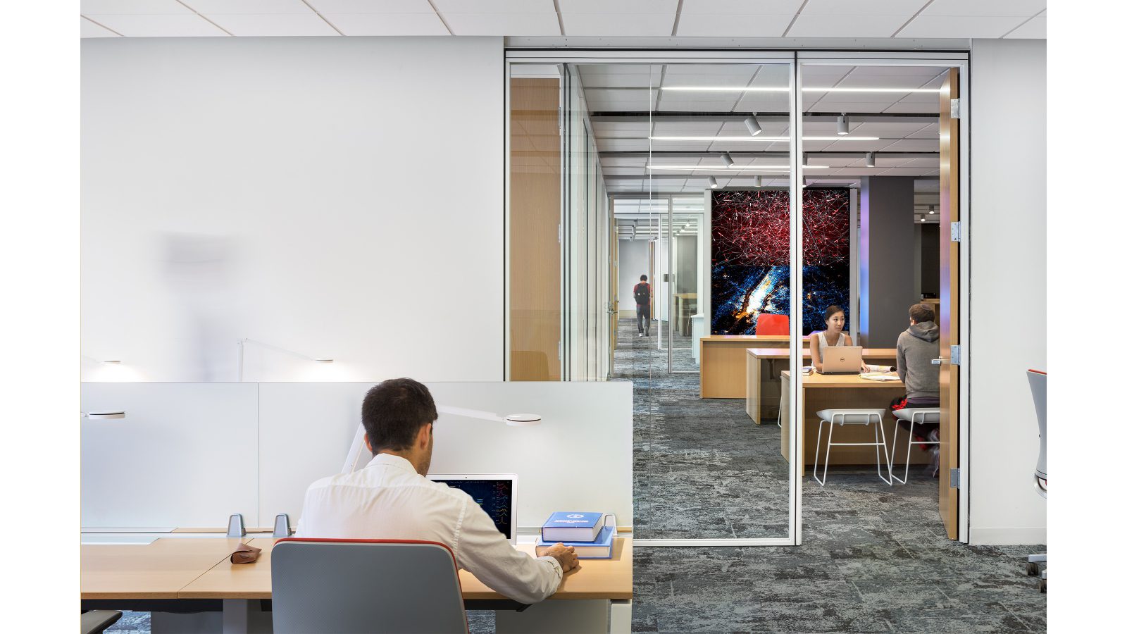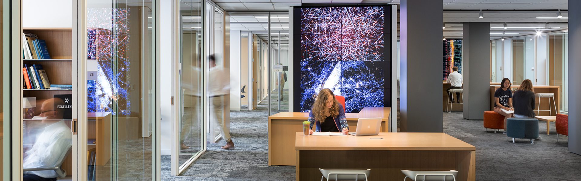 The Data Science Institute transforms an underutilized, 1960s-era engineering library into a hub for computational research. Located in the Fu Foundation School of Engineering and Applied Science (SEAS), the Institute unites multiple departments from across the campus in a single collaborative environment. The project includes private faculty offices, doctoral student workstations, a prototyping space for research projects and an array of flexible work and gathering areas. The new space was designed to diffuse boundaries and bring natural light deep into all spaces.