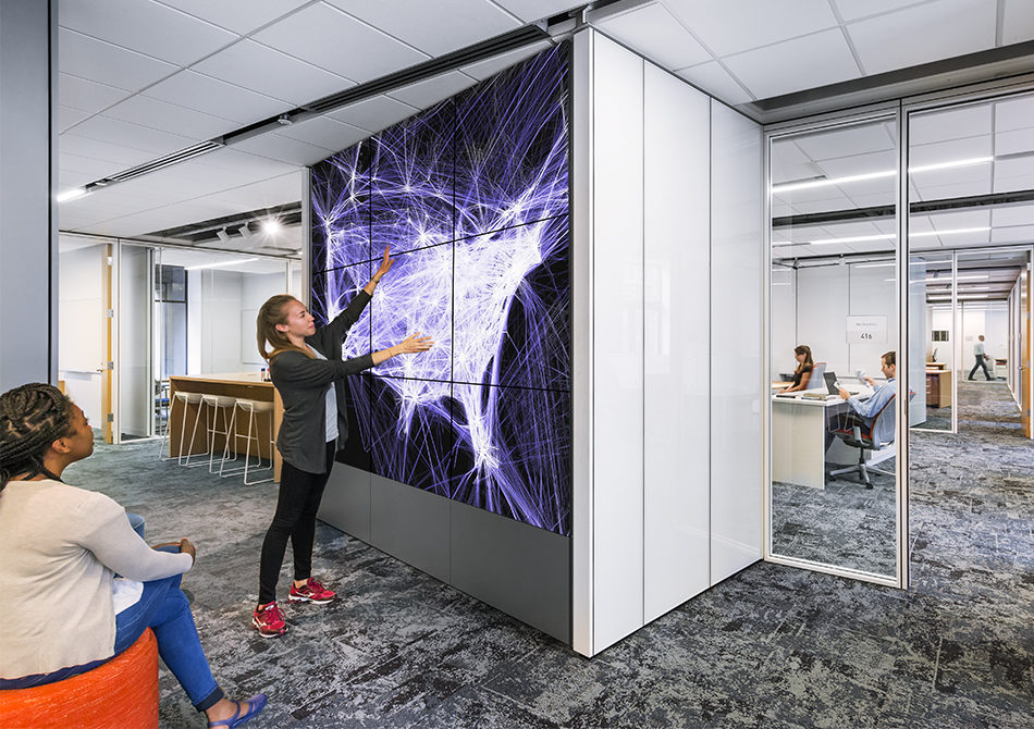 While the design continues to accommodate individually assigned work areas, personal real estate was reduced in favor of open space for group work, which is the lifeblood for the Institute. The flowing sequence of intimate, collaborative work areas is reinforced by wave-like patterns of carpeting; varied furniture arrangements, supported by white boards and media walls, encourage diverse ways of working. Tall work tables lift individuals to the eye level of passersby, promoting spontaneous discussions.