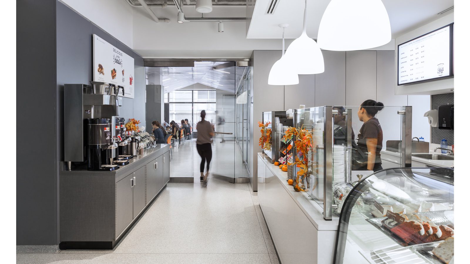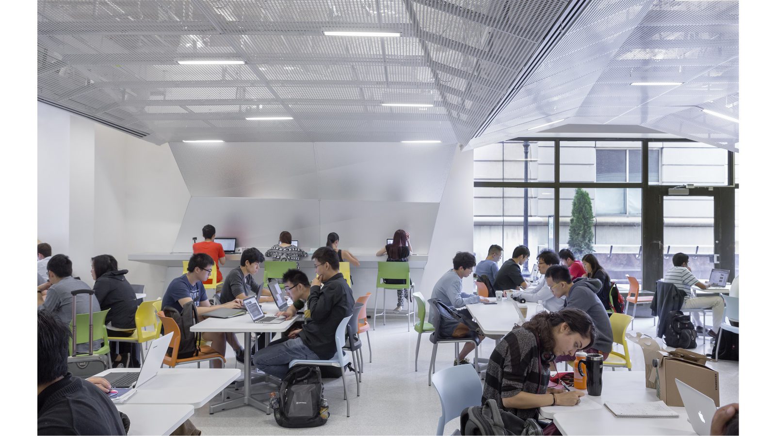 A lively new Student Commons at the building’s entrance forms an iconic meeting place for the Institute. Views through the Commons to the campus beyond lighten the formerly gloomy setting, connecting the building to the landscape. A sculptural, perforated metal ceiling unifies the entrance and Student Commons areas and introduces an unexpected feeling of verticality and lightness. With its adjacent café, the Commons is filled with students from morning to night.
