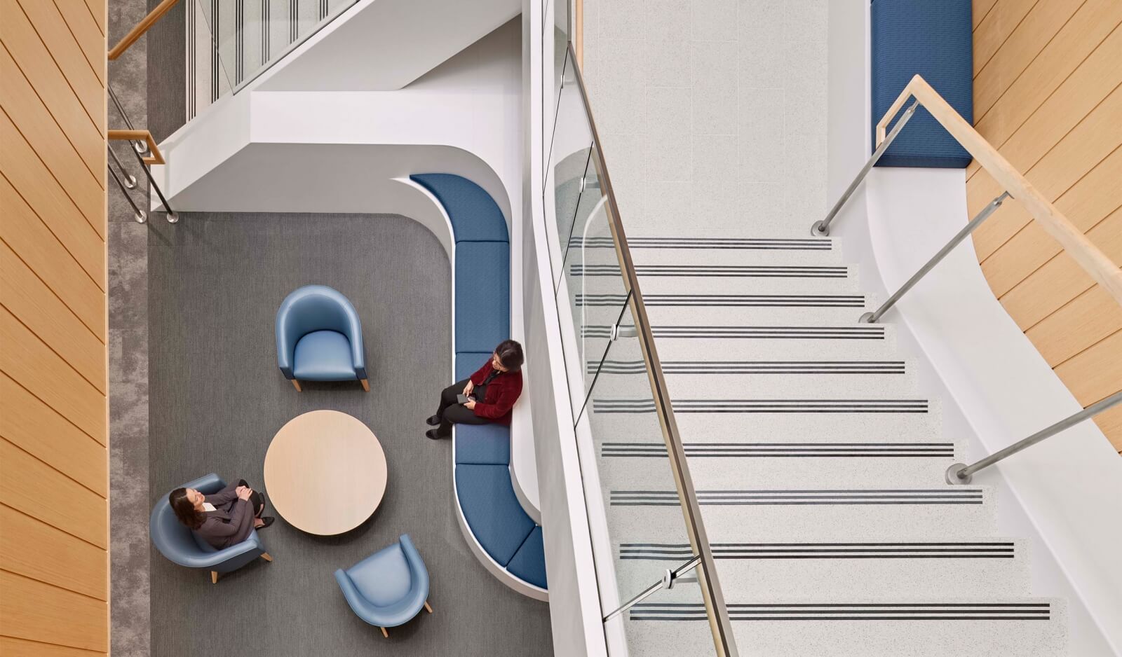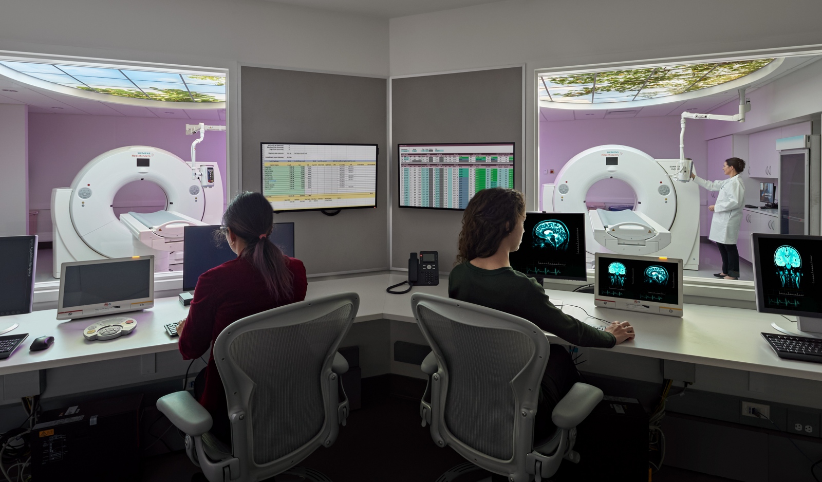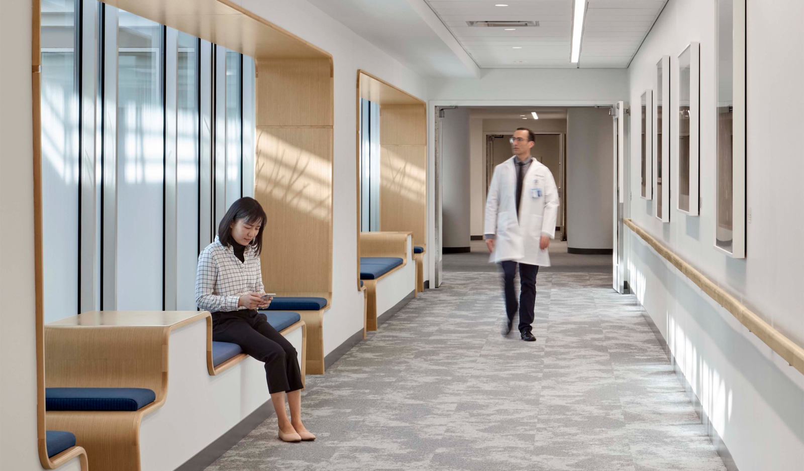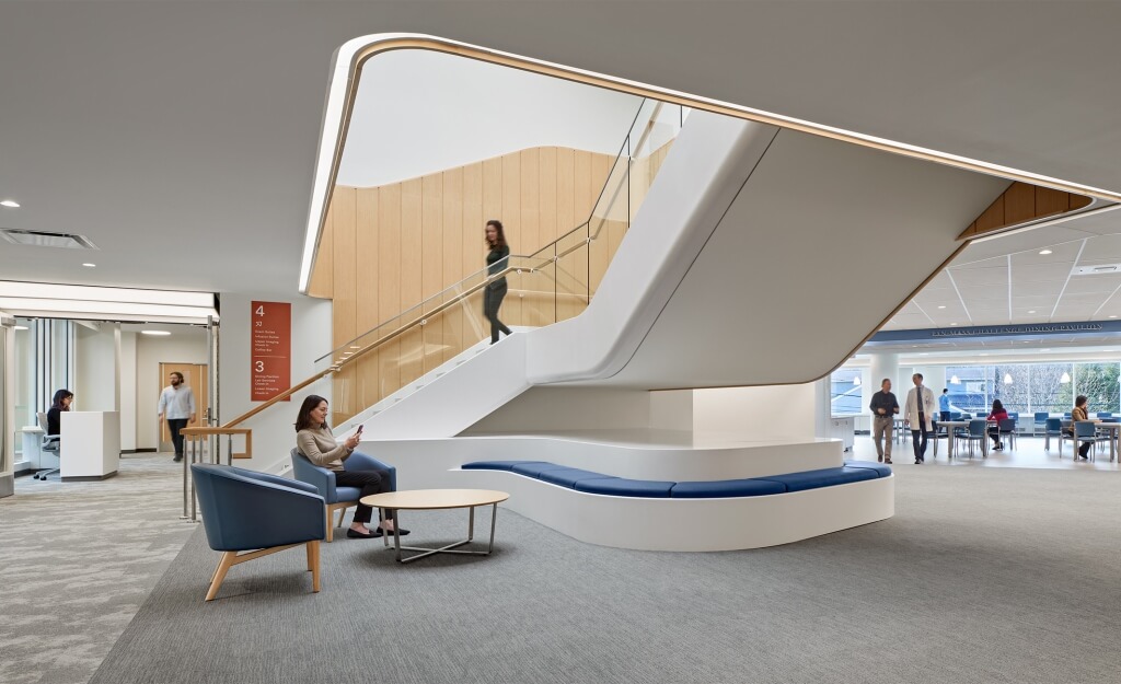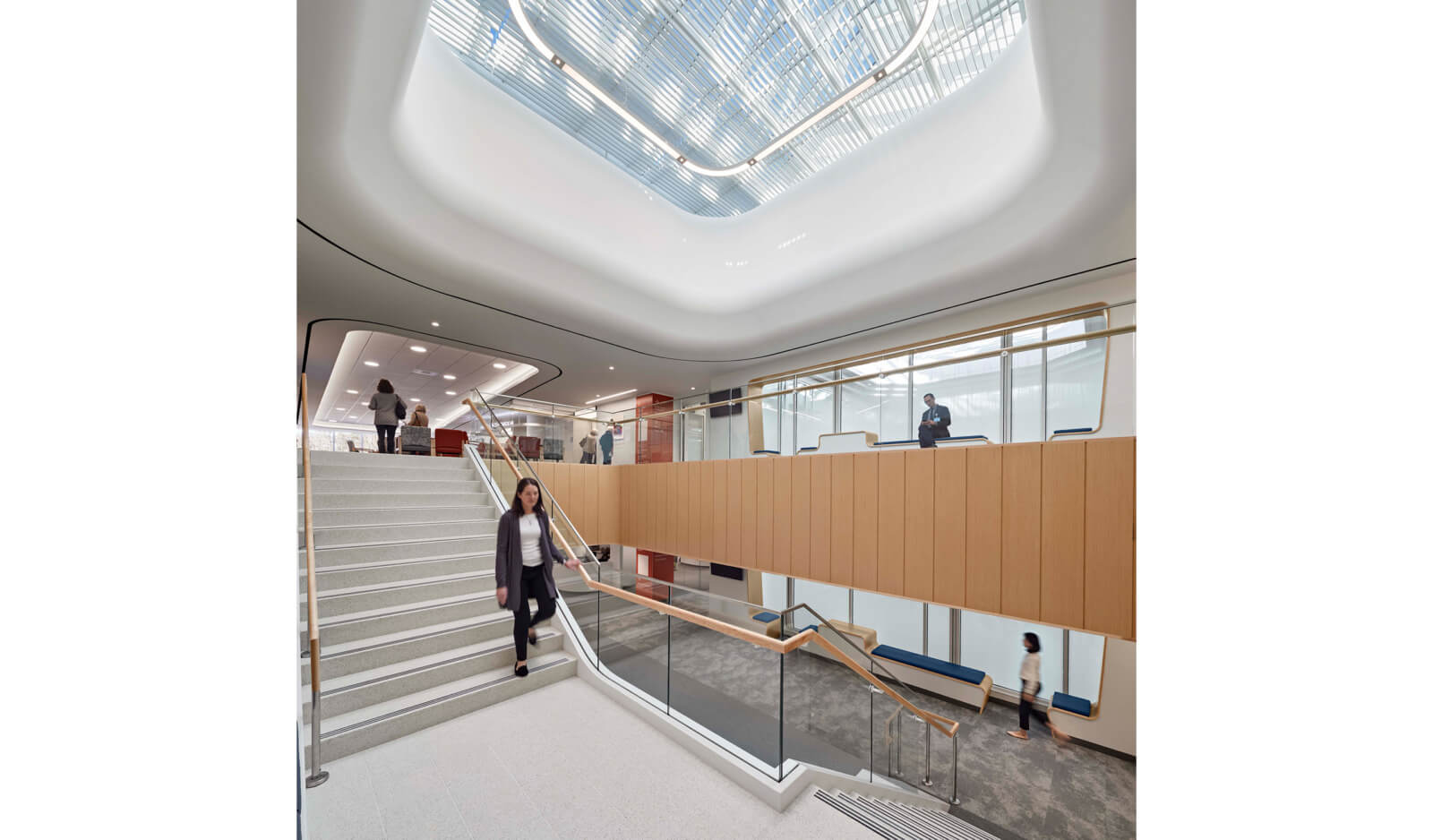Fundamentally patient focused, the design uses curved wood forms and soft sculptural elements that evoke a gentle, healing touch. Together these create individual, protected treatment experiences. Despite a large floorplate, daylight guides patients and staff throughout, with iconic new skylight enclosures and radial corridors framing views of nature. The facility strengthens a team-based care approach to effectively connect clinicians and staff in real-time collaboration.