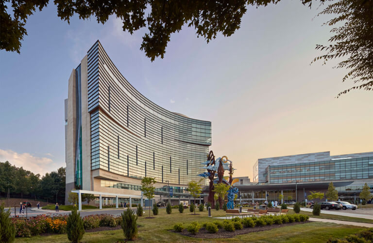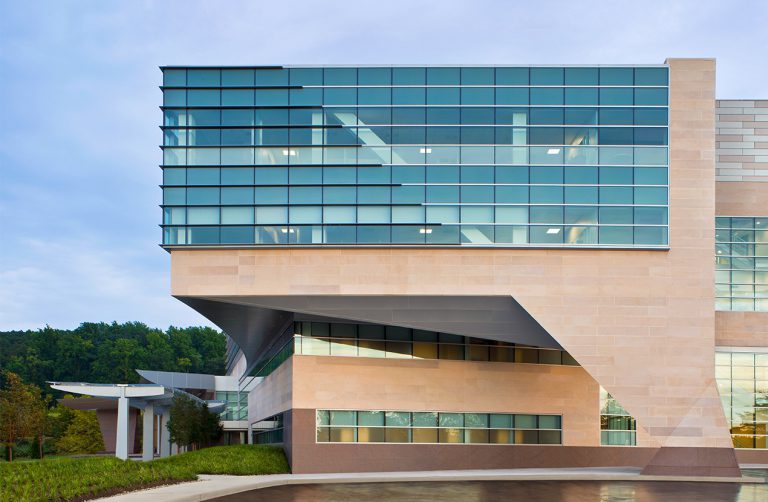 The Family Nest, a metaphor for the window in each patient room, is the key building block of the façade, mitigating the enormous difference in scale between the hospital and the individual patient and family. The Family Nest is repeated in each patient room with slightly different frames calibrated to optimize solar performance and natural ventilation, while providing comfortable space for family members.