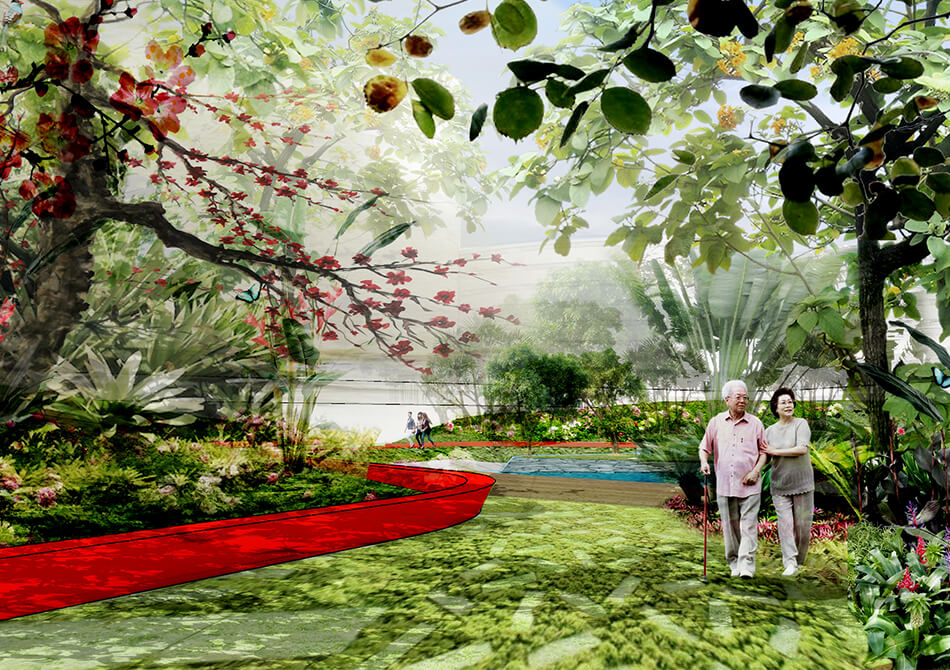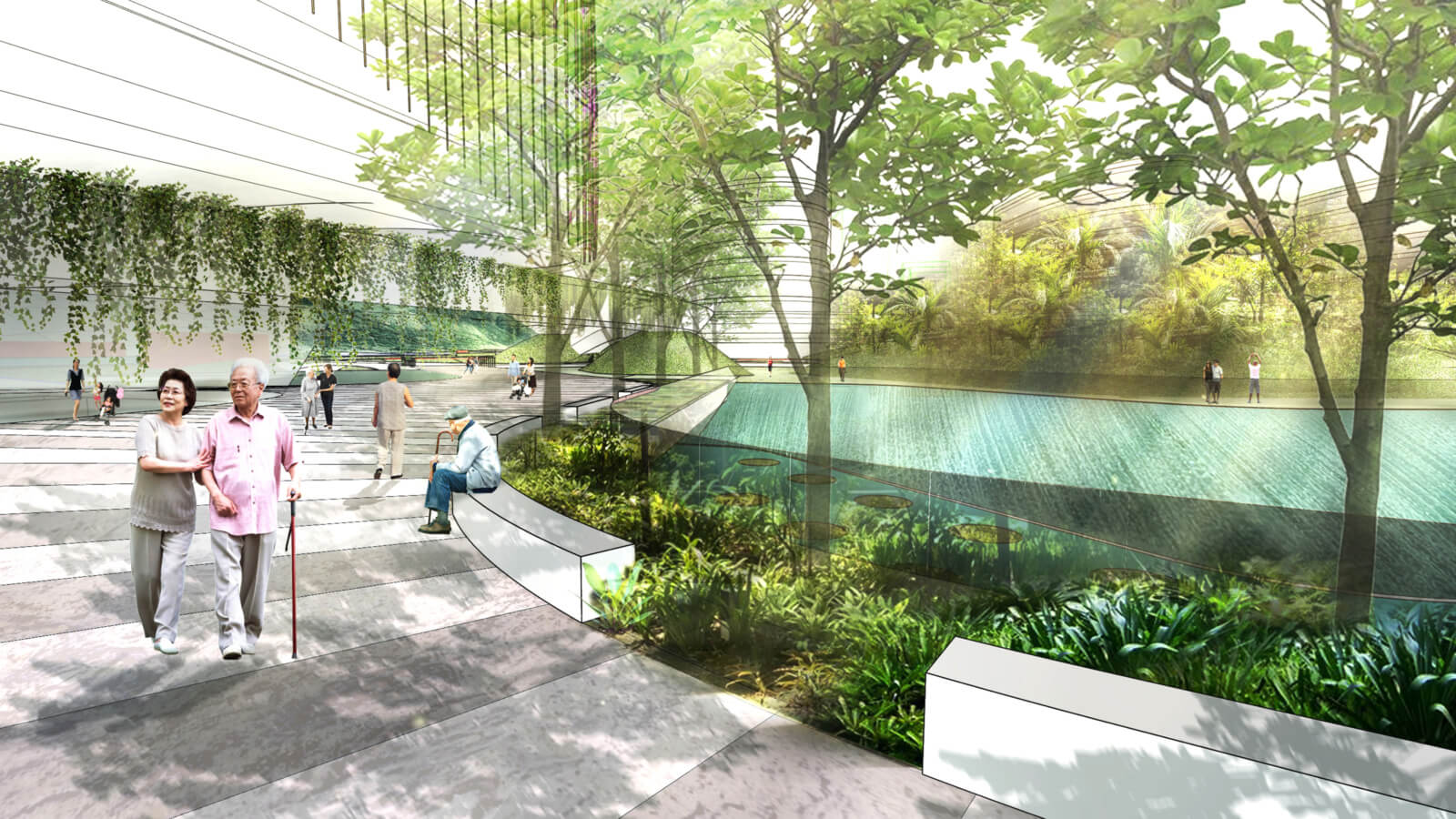 The densely packed building makes room for a large central garden, the Green Heart, shared between the main hospital and the specialty hospitals. Seamlessly integrated into the life of the hospital, it nurtures the wellbeing of patients, family, visitors and staff. A waterway winds through the landscape, connecting the Green Heart with smaller gardens, more intimate outdoor spaces and promenades. Native plantings highlight the unique local flora and create a sense of a home away from home.