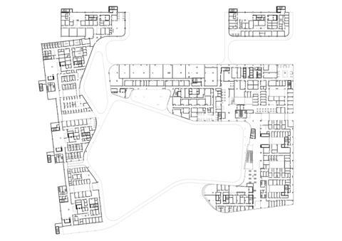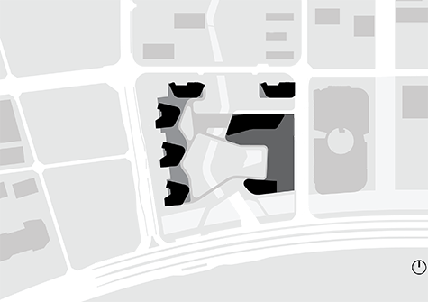 A typical approach to such a vast program would be to break it up into a series of independent buildings, distributed across the block. Instead, we conceived a single, crescent-shaped structure that leans against the city streets. The result is a continuous building that connects the hospital’s programs with maximum efficiency, providing more rational and intuitive circulation and shorter travel distances.