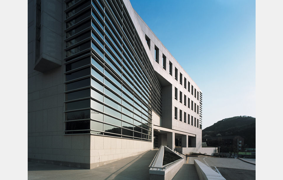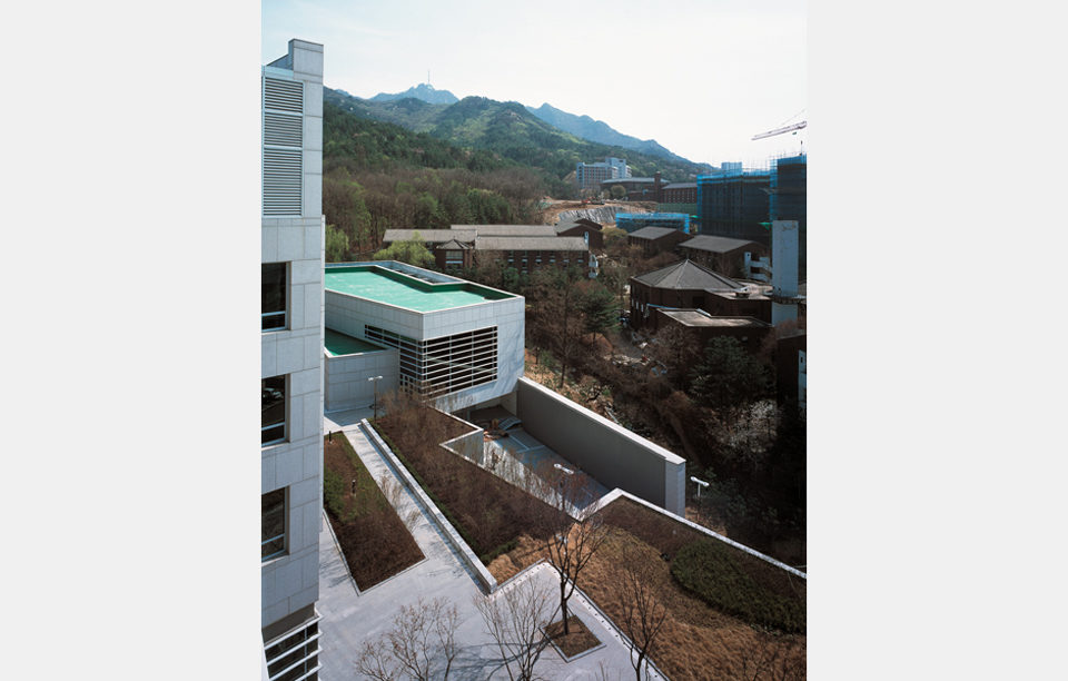 The Institute is carefully sited to create a strong formal relationship with its mountainous landscape, while reinforcing a site axis through to Kwanak Mountain behind it. The building’s form is fractured along an existing ancient footpath that extends through the site to a temple on top of the mountain, allowing hikers and pilgrims clear passage to the top. This fractured form expresses the clear functional divisions within the facility, separating administrative, research and production activities. Massing is articulated as three layers and volumes that can be read as one building or several. In the tradition of Korean landscape design, an intricate system of site walls, terraces and gardens link these forms, cradling the mountainous landscape and blurring the line between building and nature.