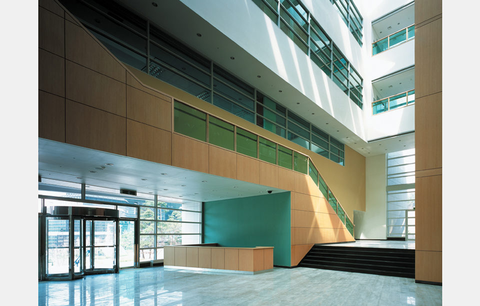 This building incurred special constraints as a project in part developed by the United Nations. Security, for example, was of utmost importance and became a design factor at the planning and siting level as well as at the detail level, yet the building was also to remain highly public. The intense security concerns are balanced against the desire to build an open and inviting building. The large-scale public spaces and ample corridors are intended to promote the general use and interaction of the people within the spaces. Special measures were taken to ensure the high-level security required for the research elements within the building.