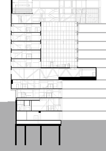 The building’s apparent simplicity belies the complexity of its construction on an impossibly small site. Remarkably, only 55% of the building’s footprint sits on grade; its upper eight stories are cantilevered 65 feet over existing operating rooms, the Emergency Department and ambulance bays, which enabled them to remain active throughout construction. Surrounded by loading docks and other unsightly urban conditions, the building redirects the focus of the streetscape to its animated Art Wall and Pocket Park, which reflect the vitality of this world-renowned children’s hospital.