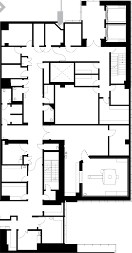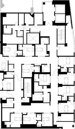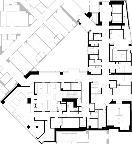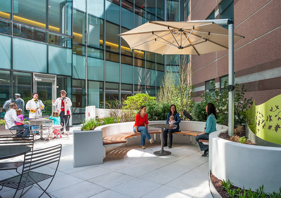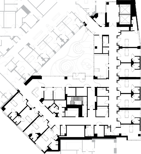 The main challenge of the project was to maximize new patient beds without compromising their quality or that of existing beds. This challenge led to a key opportunity: to create a central courtyard that gives patient rooms and staff areas light and views, despite the tight constraints of the site. This “hanging garden” is a quiet oasis suspended six floors above the street, offering a refuge for patients, families and staff of the adjacent Bone Marrow Transplant Inpatient Unit.