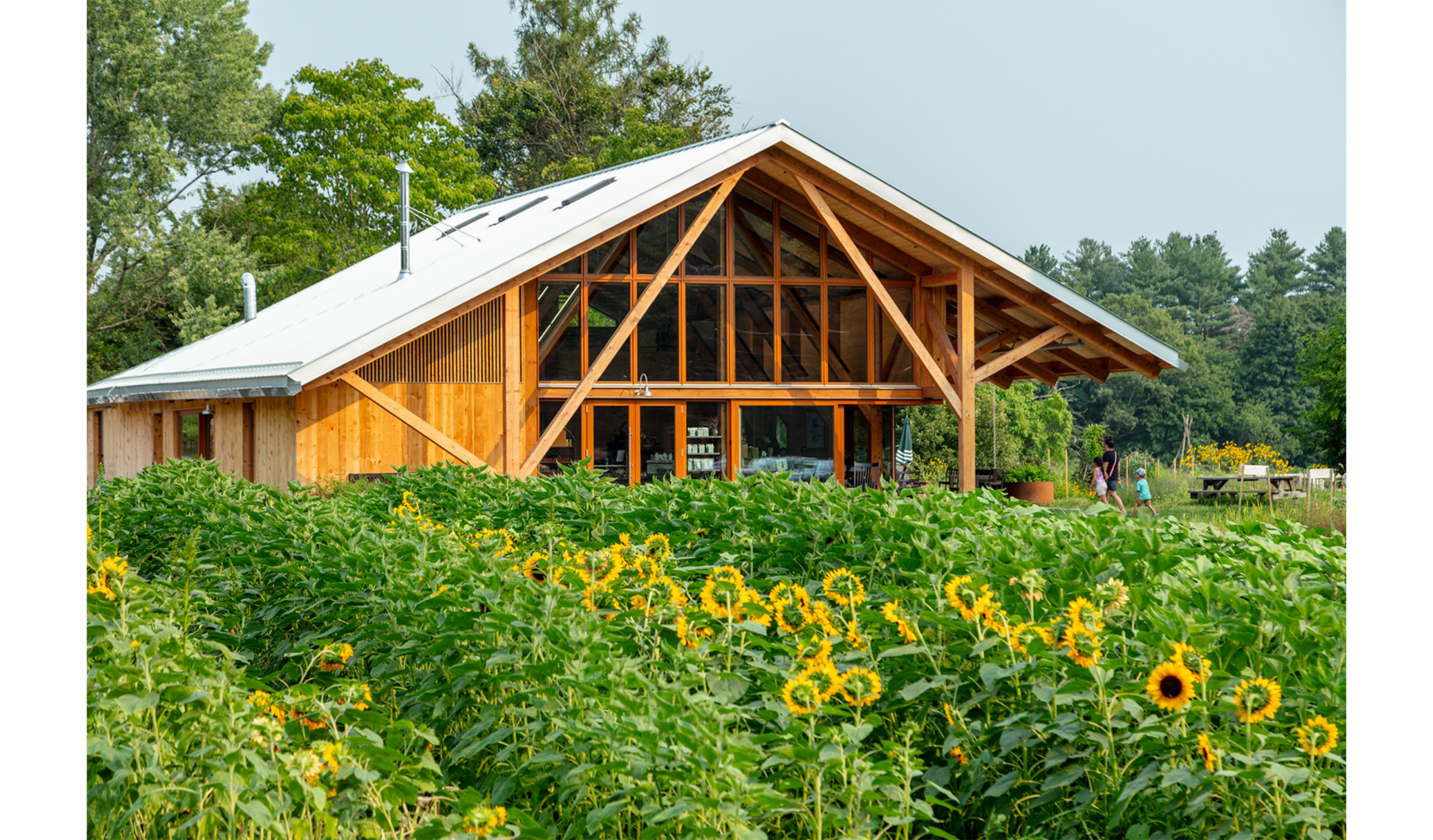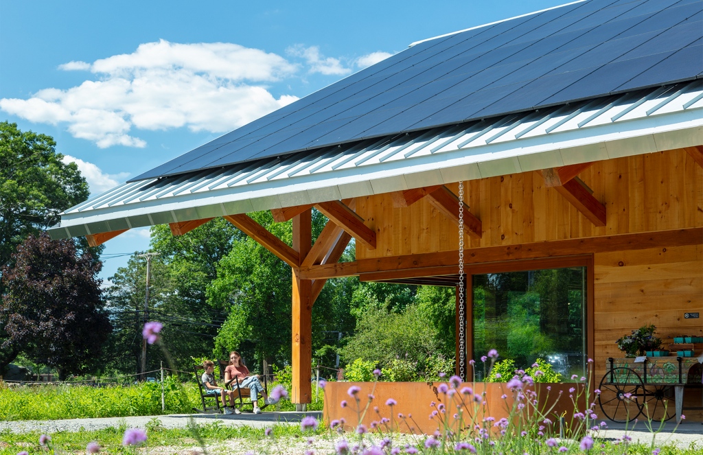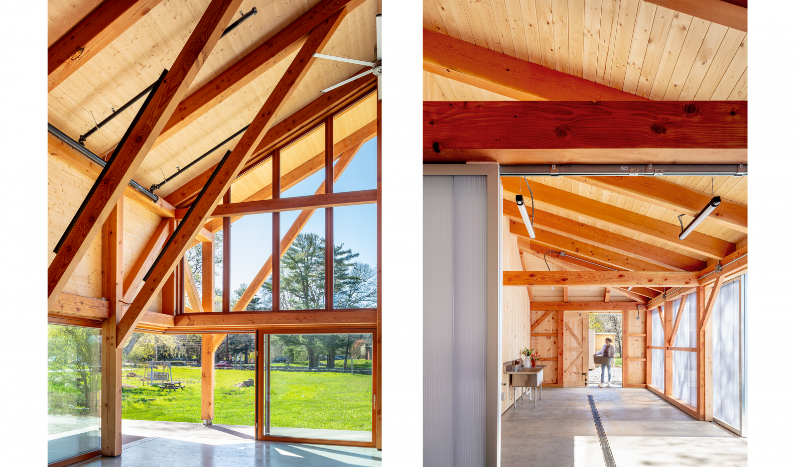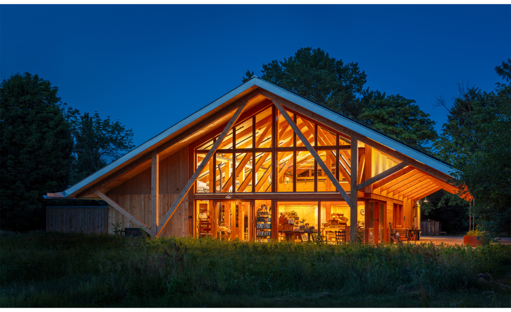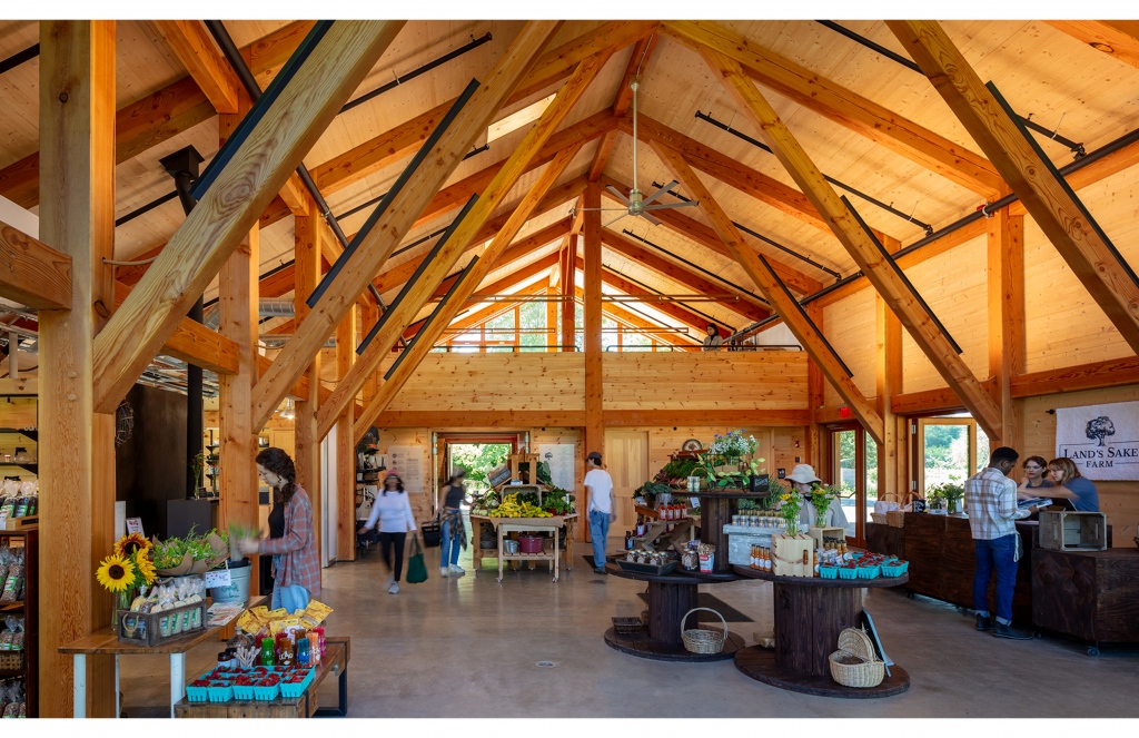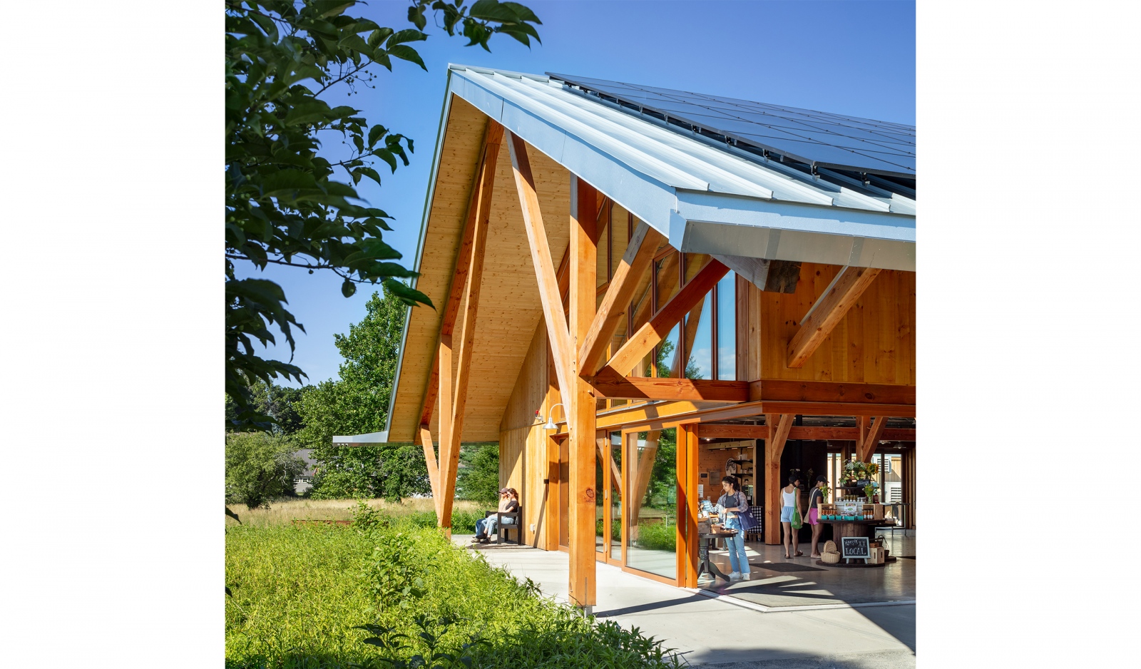 A heavy timber pavilion floating in the landscape; the Farmstand is a place to gather entwined with nature. Capped with an iconic solar array and an ever-changing roof line that embraces the Farmstand below, it is enclosed with a wood curtainwall system with sliding glass panels that transform into an open-air structure during the warmer months. Back of house functions are clad in natural pine siding and a system of translucent sliding panels to bring light into work areas—opening and closing in response to weather, time of day, type of use or season. Locally sourced timber and handcrafted details permeate the entire structure to provide a radiant materiality throughout.