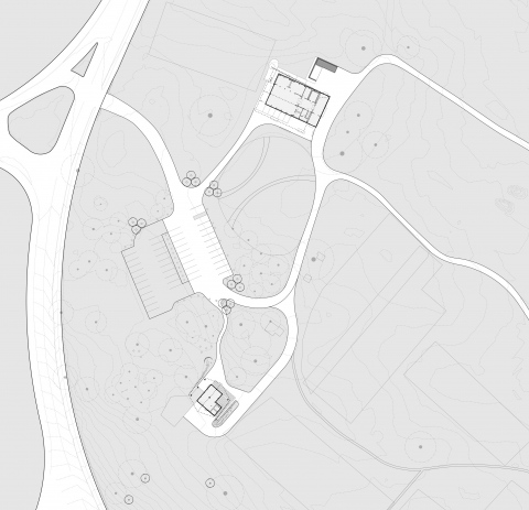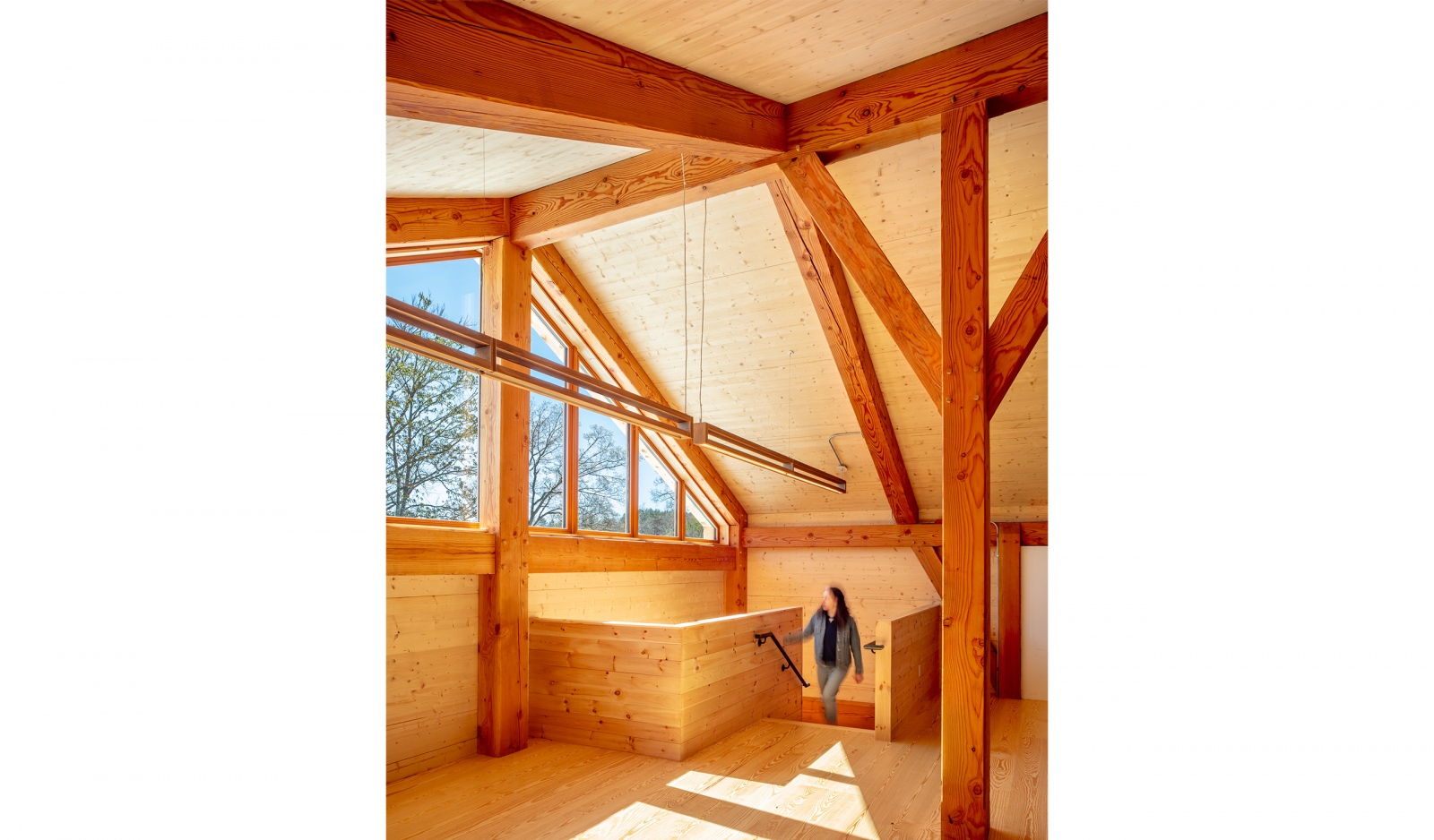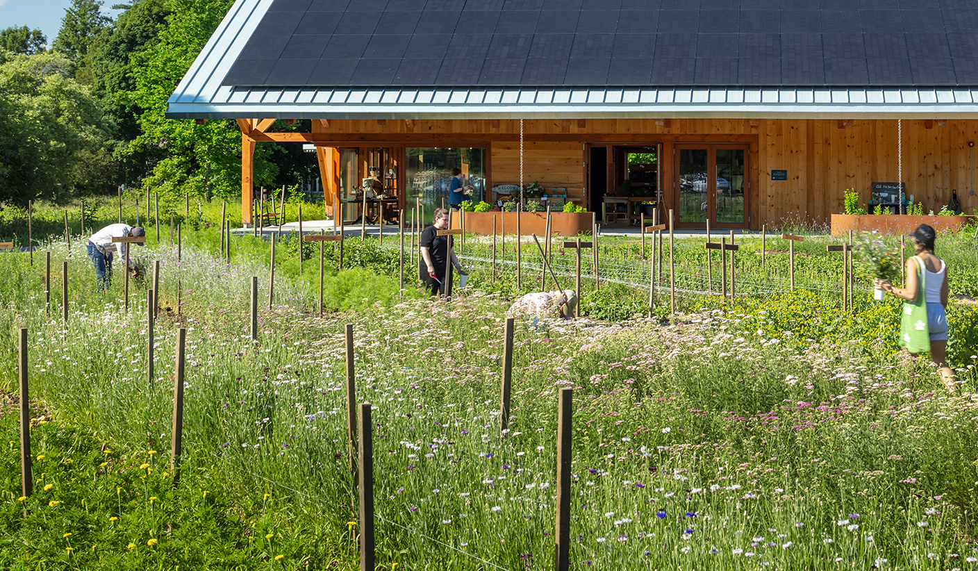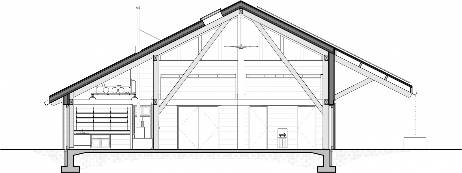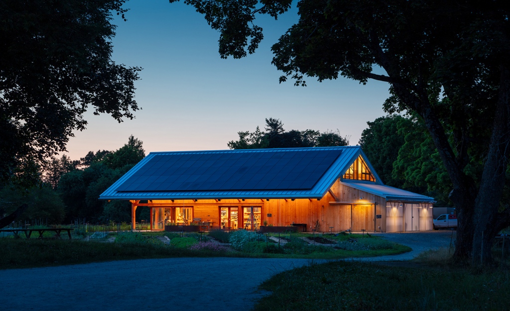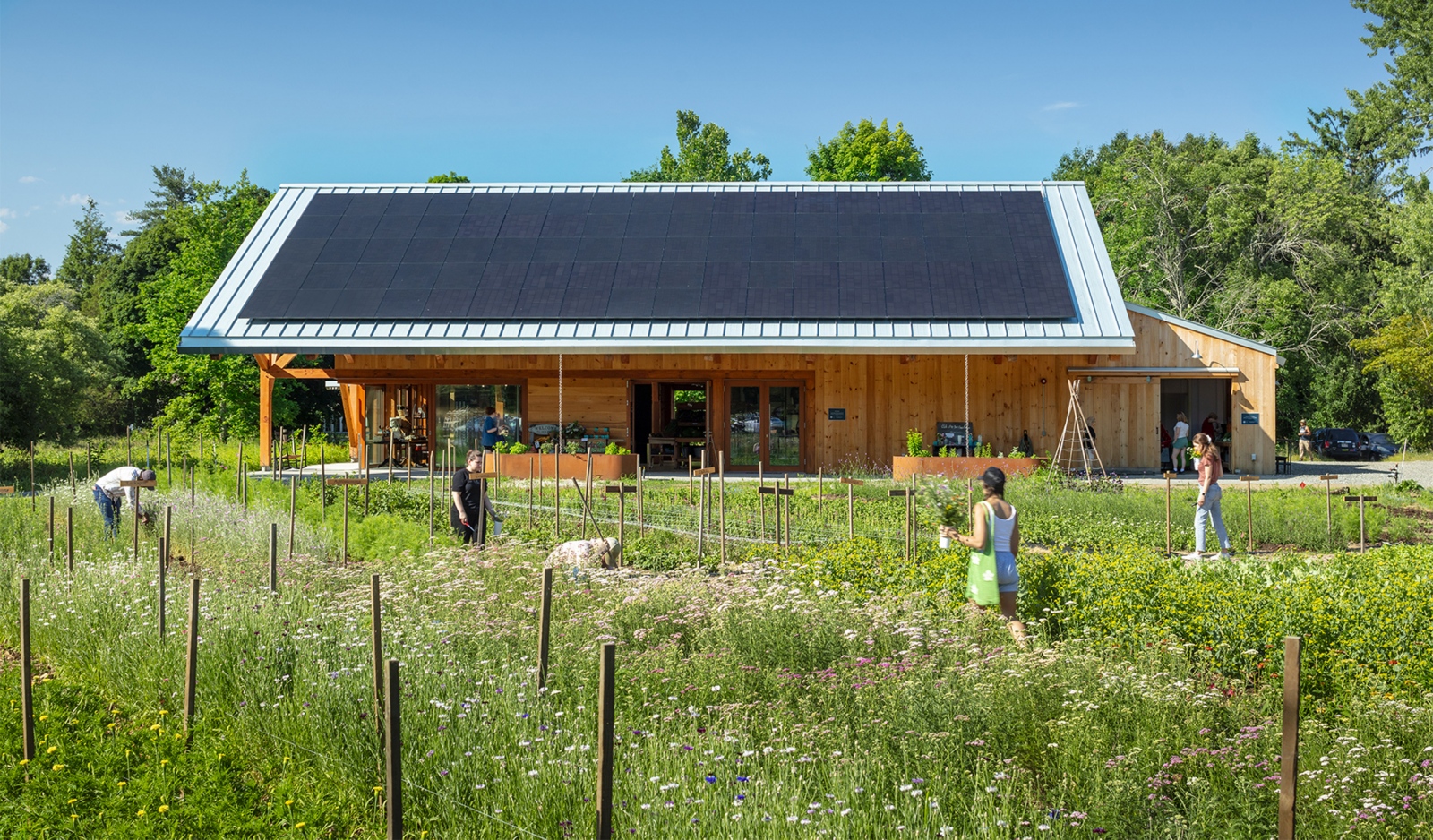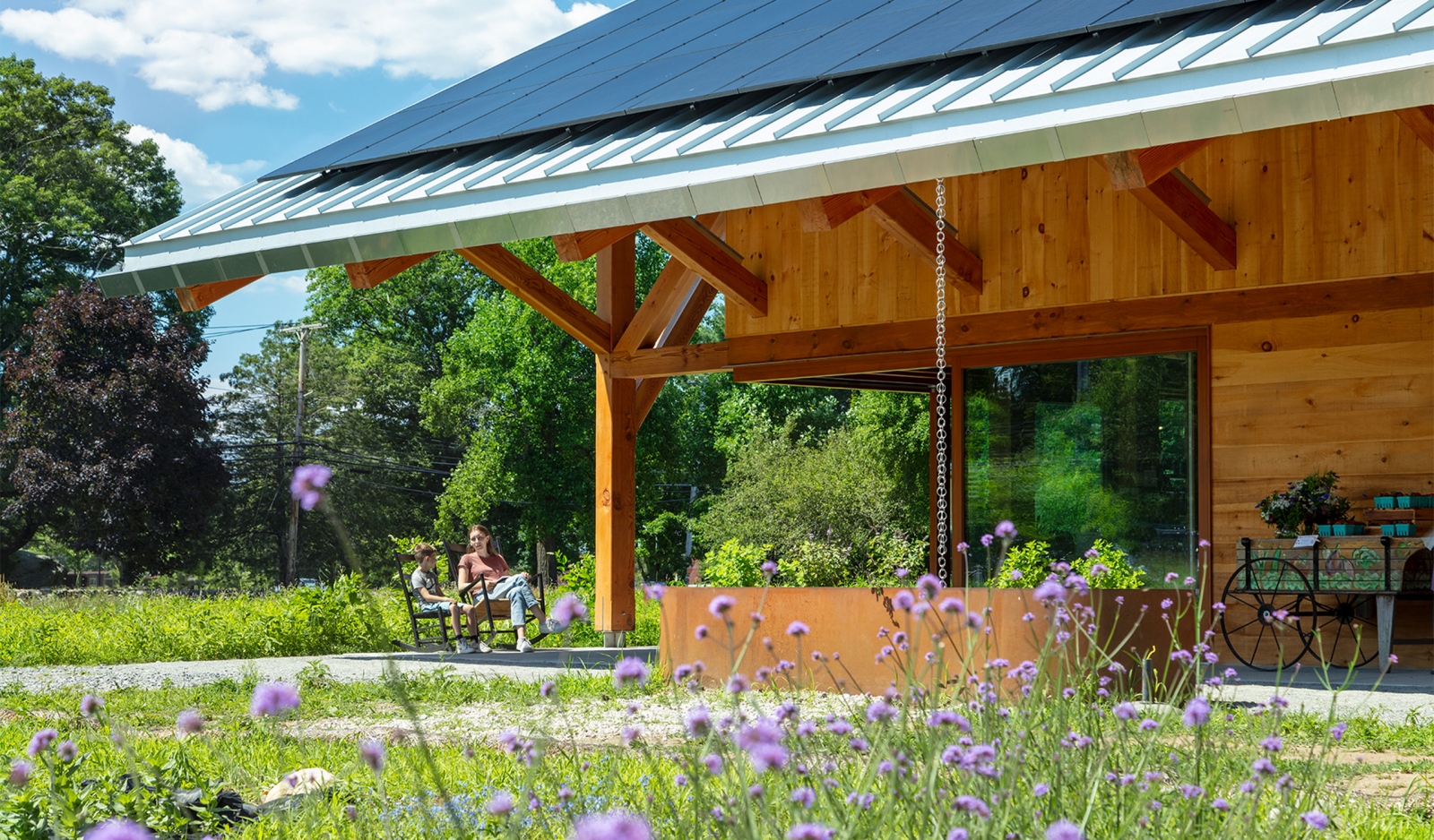 A heavy timber pavilion floating in the landscape; the Farmstand is a place to gather entwined with nature. Capped with an iconic solar array and an ever-changing roof line that embraces the Farmstand below, it is enclosed with a wood curtainwall system with sliding glass panels that transform into an open-air structure during the warmer months. Back of house functions are clad in natural pine siding and a system of translucent sliding panels to bring light into work areas—opening and closing in response to weather, time of day, type of use or season. Locally sourced timber and handcrafted details permeate the entire structure to provide a radiant materiality throughout.