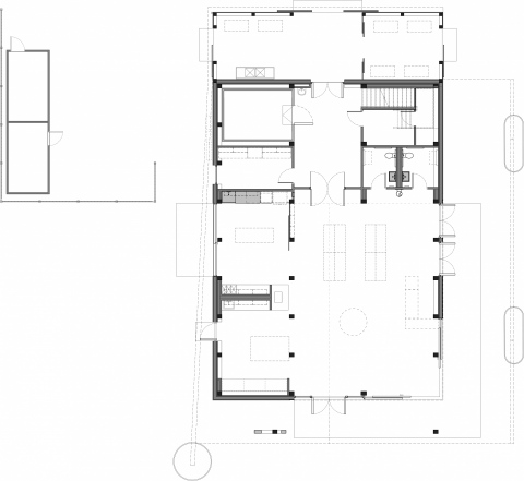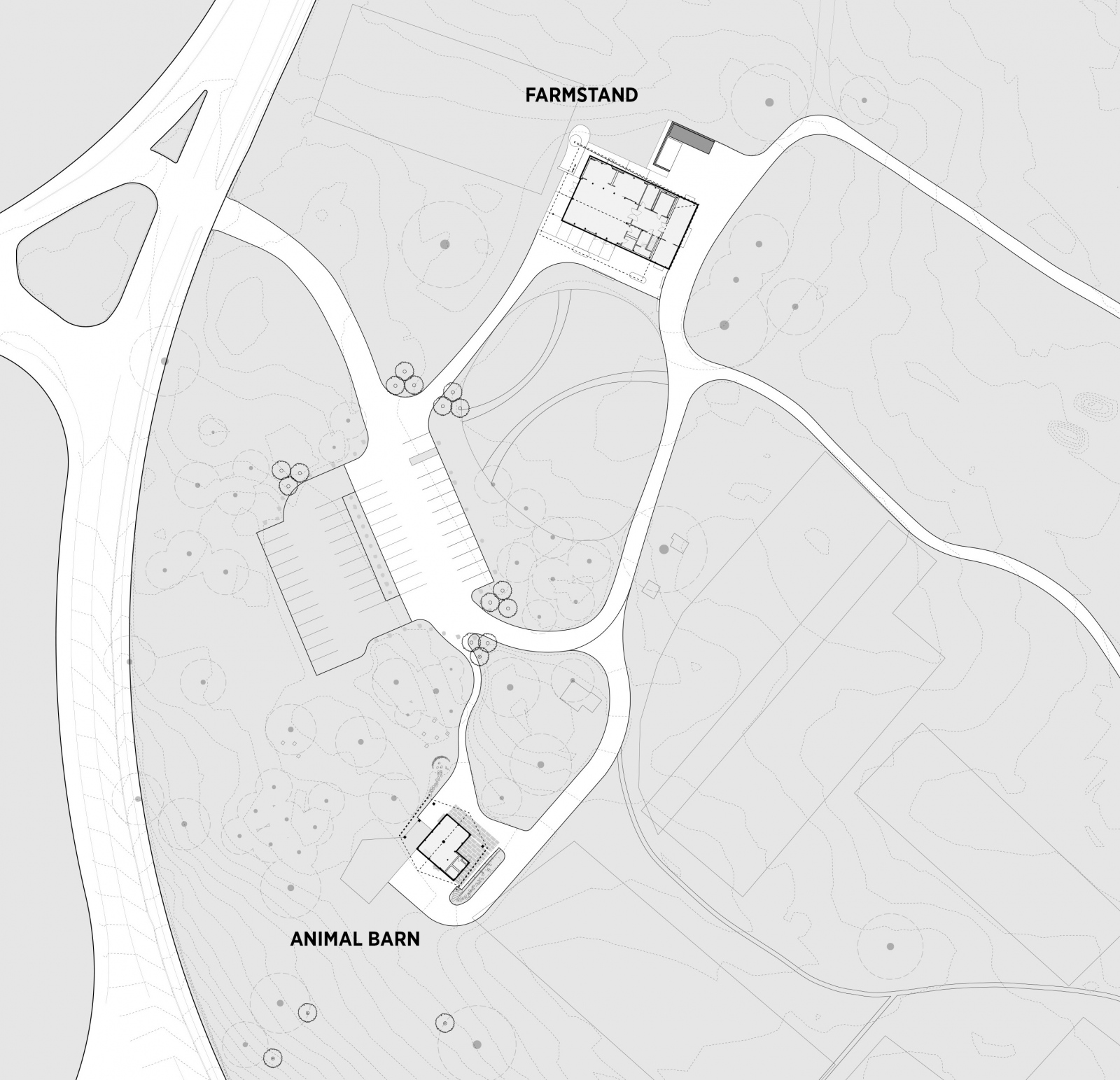 The Farmstand is organized into two distinct zones, open front-of-house functions such as the commercial farmstand and demonstration kitchen and more enclosed back-of-house service functions such as the walk-in cooler, storage, staff office and washing stations for vegetables. An open-air porch wraps the Farmstand on the south and west facades, shielding the building from the harsh summer sun and providing additional covered space for picnic tables and produce. A small open-air loft above the back-of-house functions overlooks the main space, providing staff work space and a place for educational programs.