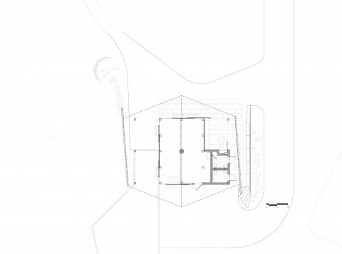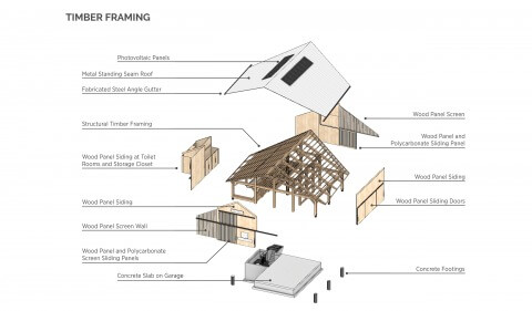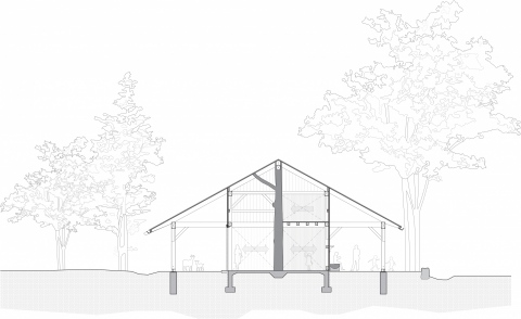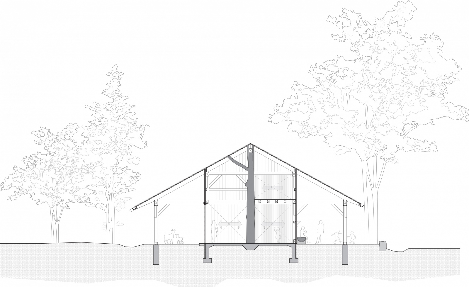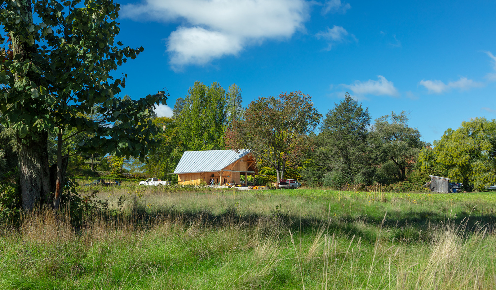 The fundamental concept is that of a pavilion floating in the landscape, serving both as a shelter and a gathering place. The intriguing changing shape of the roofline and its relationship with the enclosed components of the barn below create a dynamic interplay between the two forms. A system of translucent sliding panels brings light into the barn and creates an ever-changing façade as the building opens and closes in response to weather, time of day, type of use, or the season. Locally sourced timber and handcrafted details permeate the entire structure, providing a radiant materiality throughout.