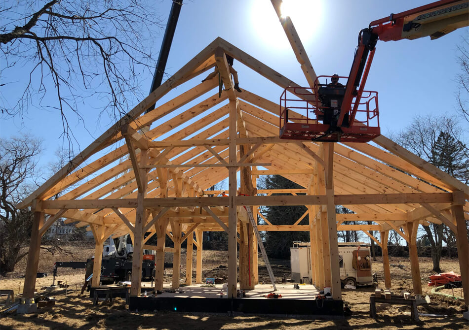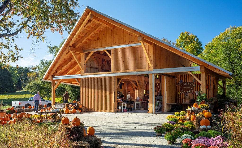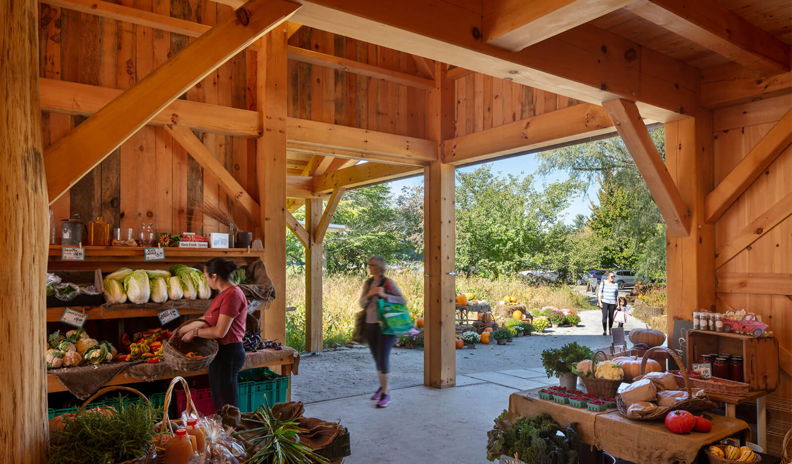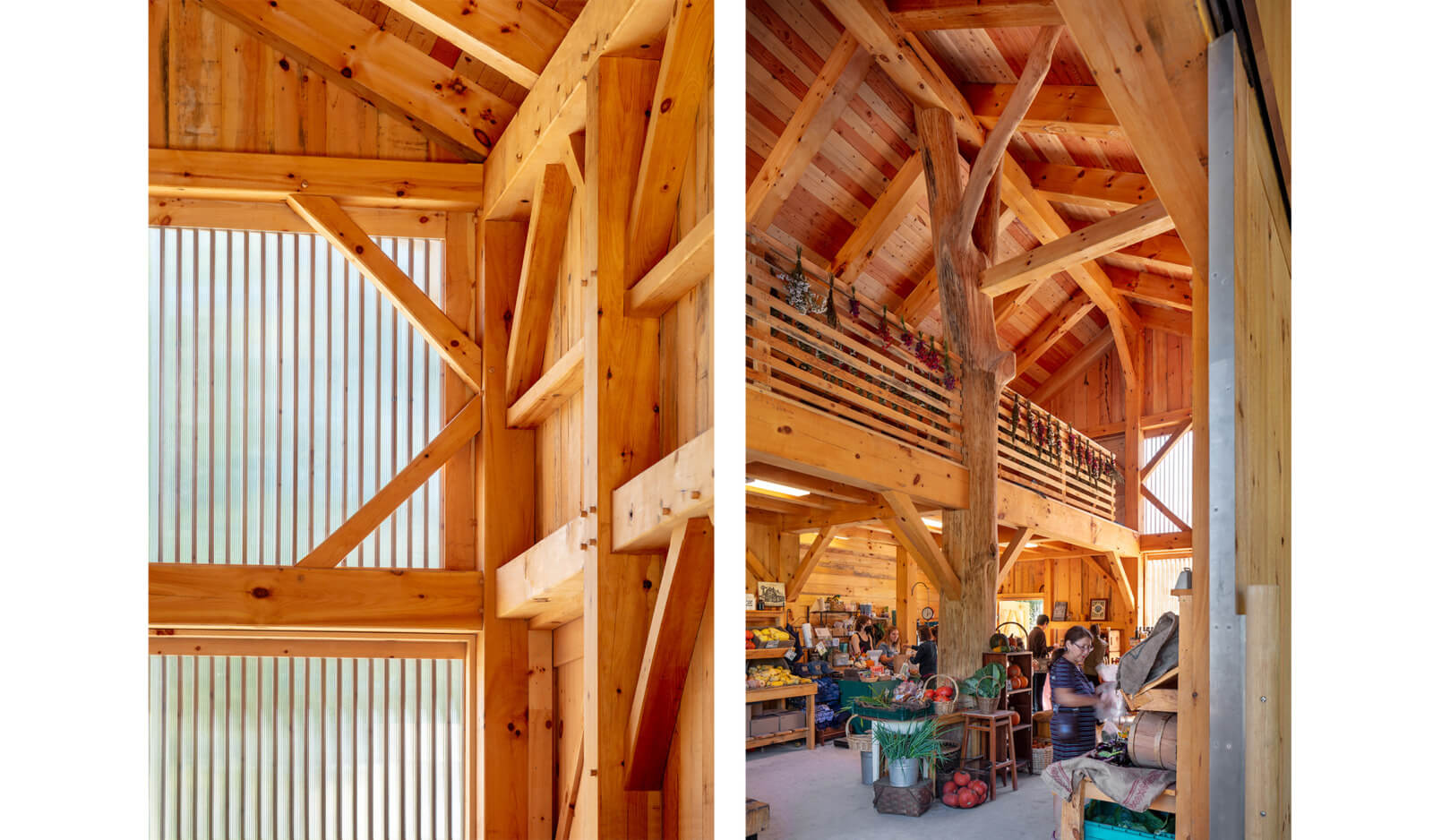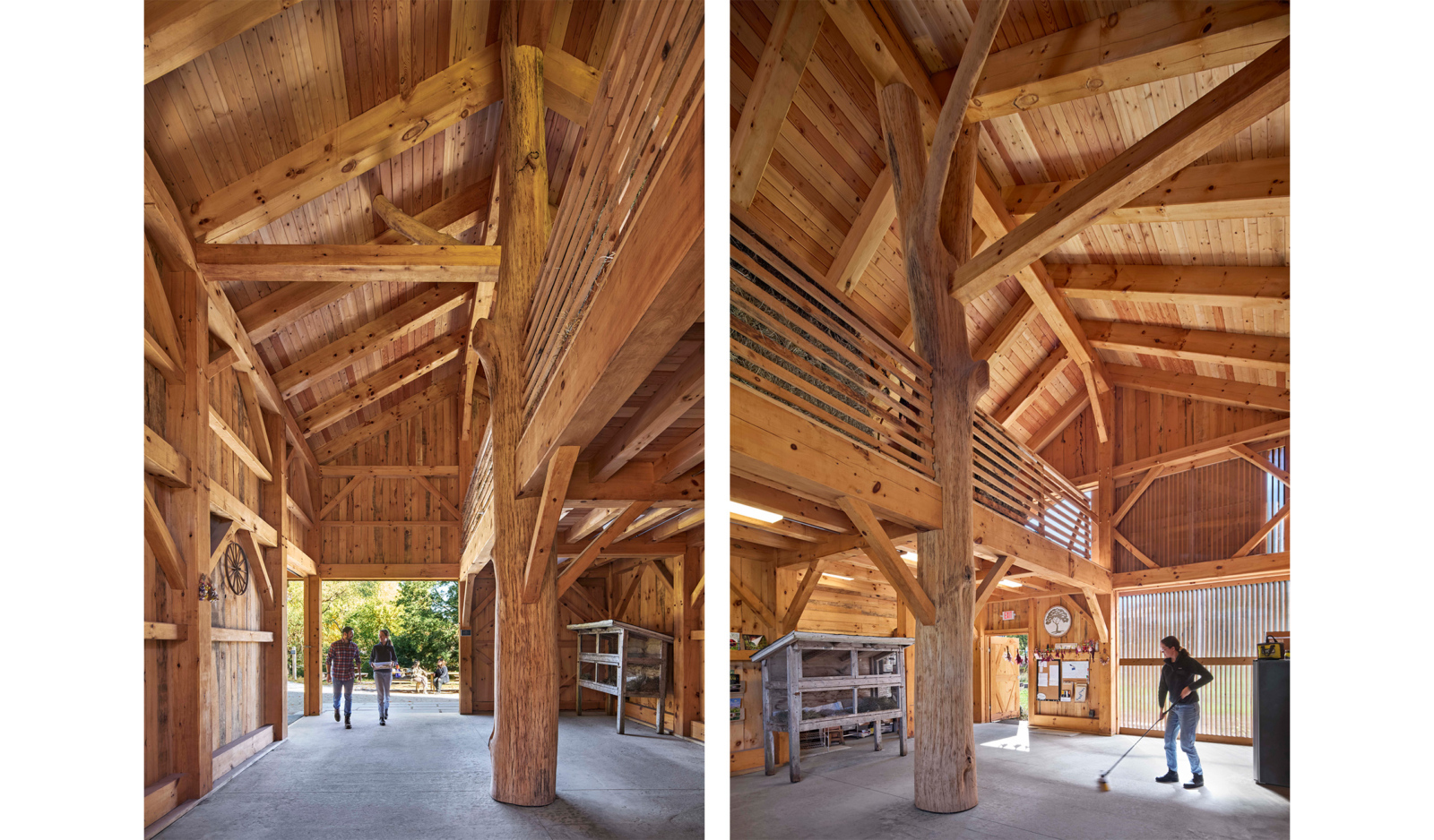 The detailing of the heavy timber structure is a significant character in the story. The wood for the barn’s structure was harvested less than a mile away from the farm in Weston and sawn at a nearby women-owned saw-mill. It is not often that an architect gets to pick the trees in the forest that become the building, but in this case, that is exactly what we did. During one of our excursions into the woods, we came upon a special oak tree that “told” us it wanted to become the center post for the barn; it became the most magical part of the structure.