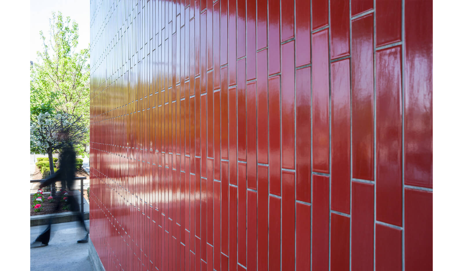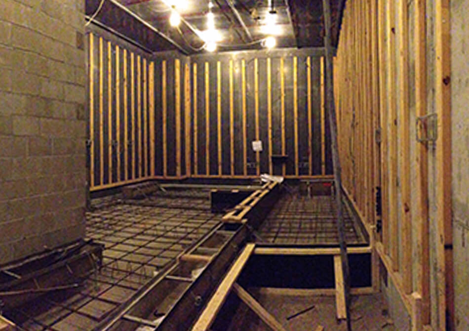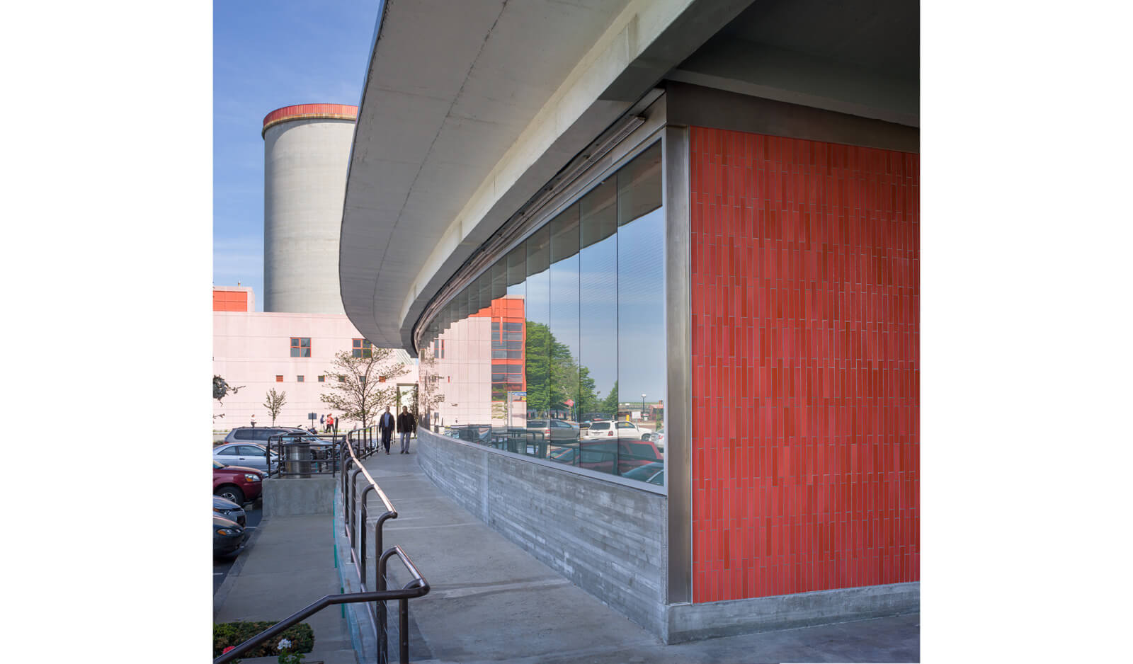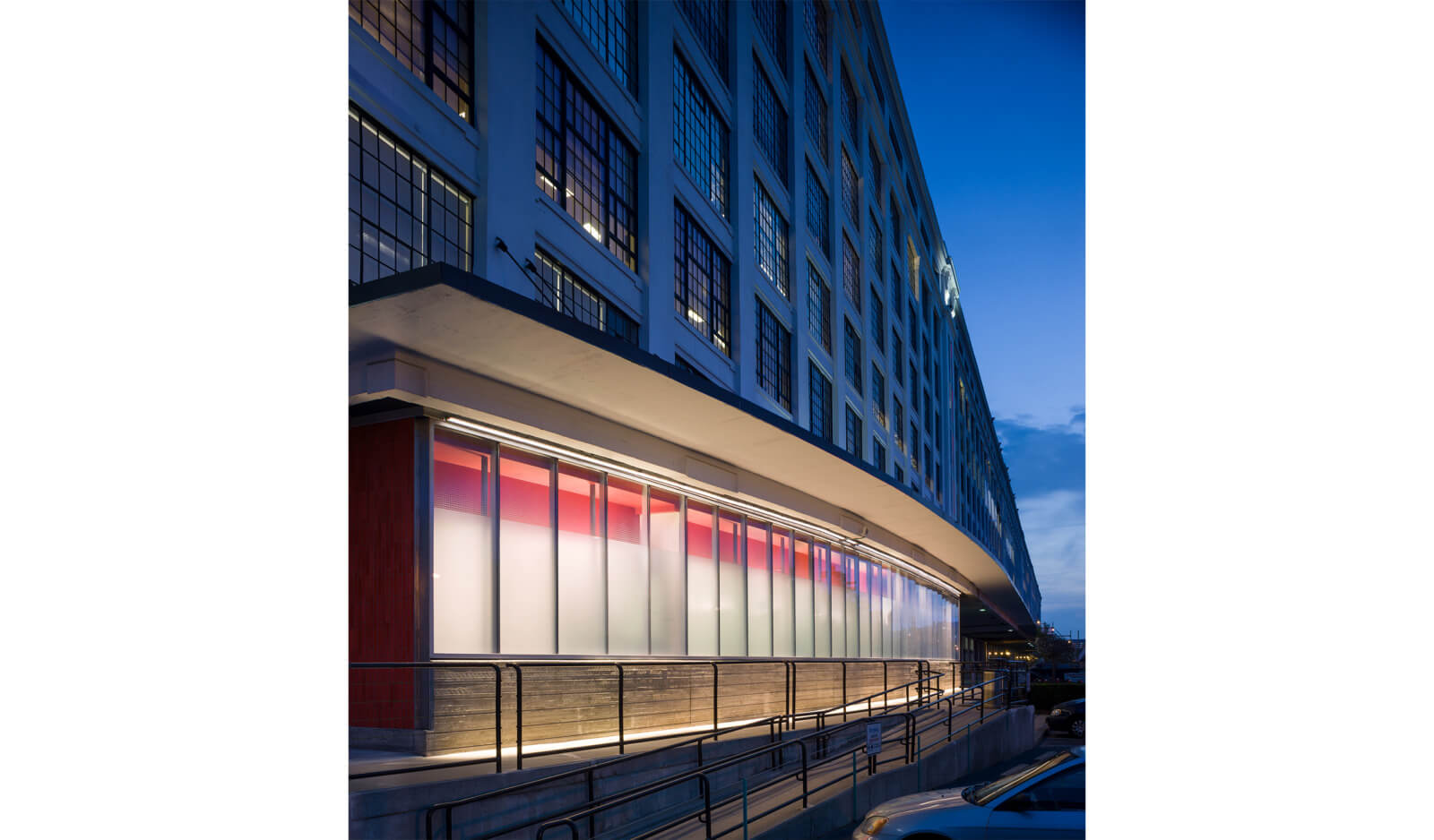 The delicate renovation includes a complete new mechanical system. Built in 1917, the concrete structure of this former military warehouse supported the conversion of an elevator shaft into a new services path to a dedicated rooftop mechanical penthouse and the 55,000 lbs. cyclotron. Its sturdy slabs and ample floor height also permitted construction of new magnetic and radiation shielding systems and under-slab trench pathways for product delivery. The expansion below the existing loading canopy is a freestanding assembly of structurally insulated panels (SIPs) and refined columns that follow the gentle curve of the building.