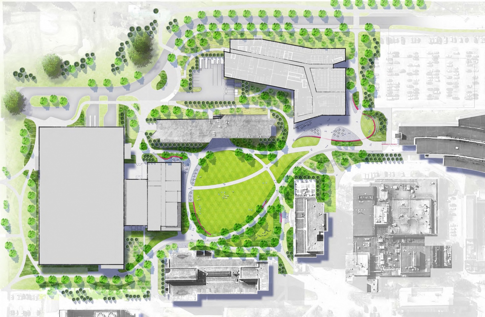The College of Engineering Master Plan establishes a vibrant West Campus precinct, transforming it into a campus district equal in quality to the best spaces on the adjacent University Park Campus. The Master Plan creates a singular vision for this precinct with the EDIB as the first of four new buildings. Collectively, these buildings, and the signature landscape environments they define, will accommodate a range of synergistic programs creating the opportunity to re-align research space into strategic thematic groupings and focus on the shared use of space to increase utilization at a scale that will change the culture of the College of Engineering for decades to come.