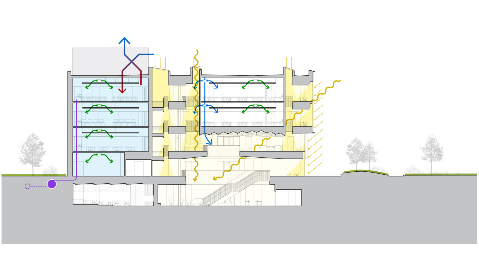 Anchoring ECoRE is the Vertical Commons, a dynamic study commons, showcasing the social energy of the entire precinct and establishing a vibrant new identity for the College of Engineering. As a focal point for interdisciplninary thinking and collaboration, the ECoRE Building re-aligns research info thematic groupings and focuses on shared use and space optimization at a scale that will change the culture of the College of Engineering for decades to come.