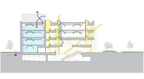 Connecting five floors of robust engineering, the Vertical Commons serves as a front door for the College and projects an invitation to all. With four floors above grade and one set into the ground below the plaza, the Commons uses open study spaces of varying size as a thermal blanket, daylight moderator and visual beacon. Housing the living room, café, student services and high-volume classrooms on the lower floors, the intimacy of public space and intensity of the engineering programs increase as one moves both up and down. Low vibration spaces below grade enable specialty core research facilities including anechoic chambers, wind tunnels, flight simulation, structural labs and a 27,000 cubic foot roto-craft ice testing research facility.
