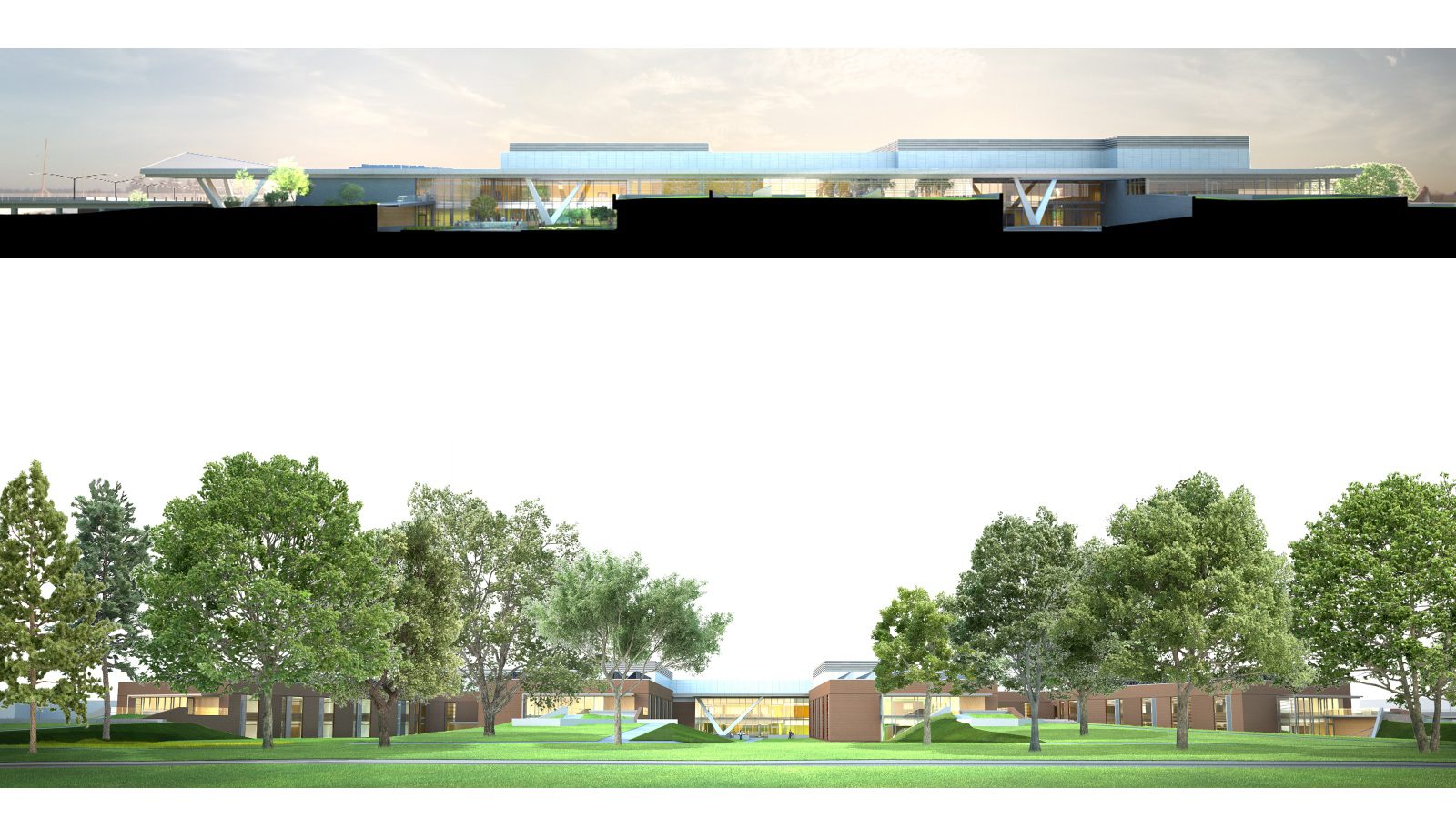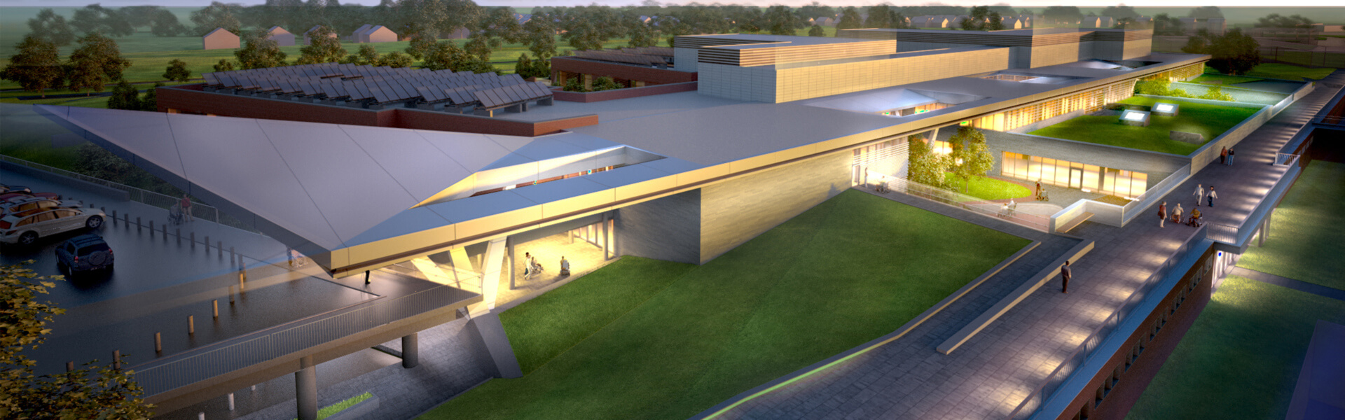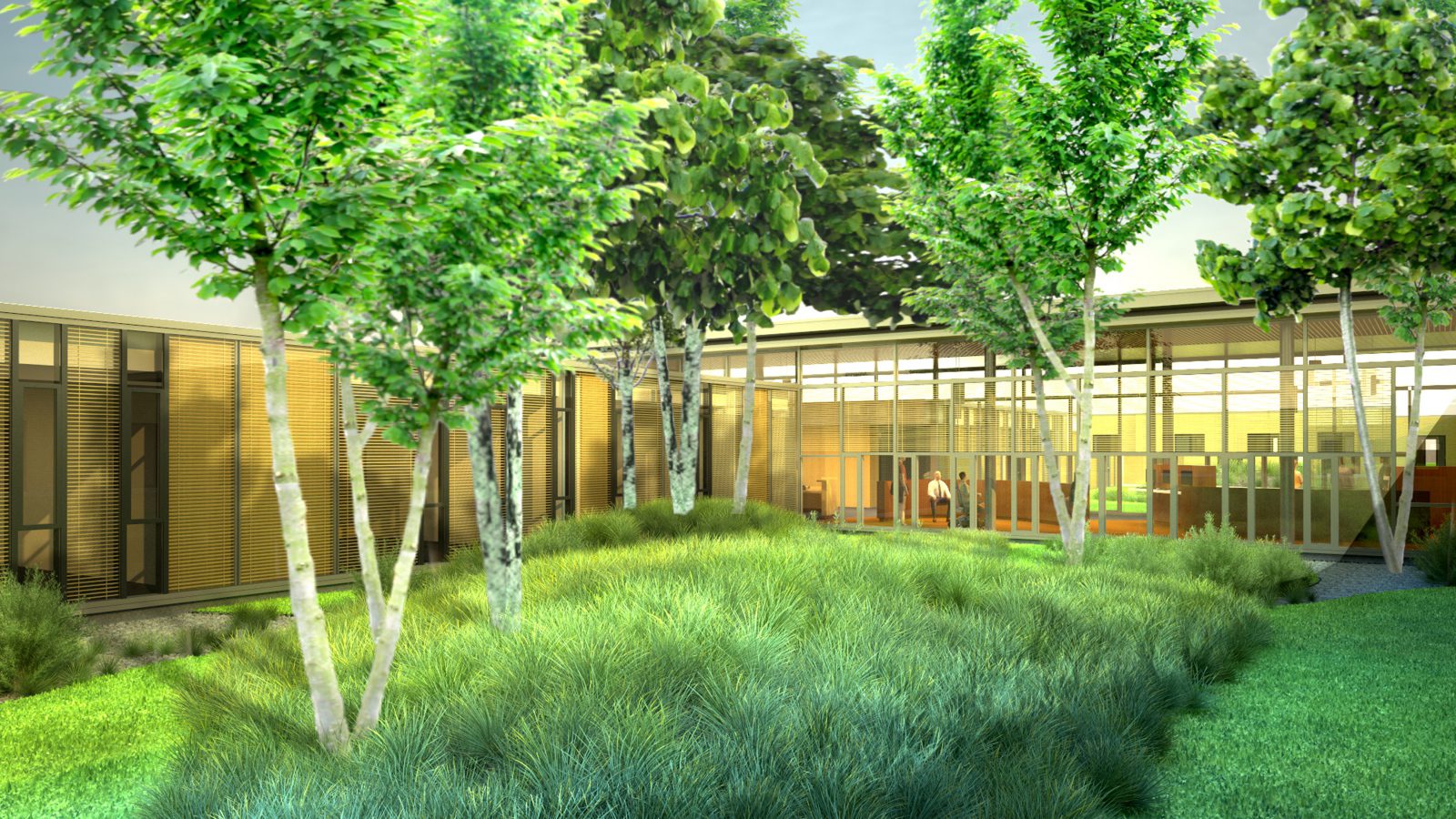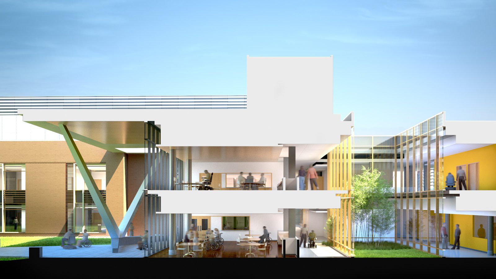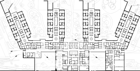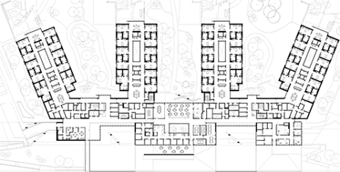 The building is organized around four houses that extend like fingers into the landscape to embrace small neighborhoods. Main Street runs the length of the facility, linking all the programmatic elements, the main lobby, the neighborhoods, the therapy programs and two therapy courtyards, which allow daylight and nature to penetrate deep into the building.