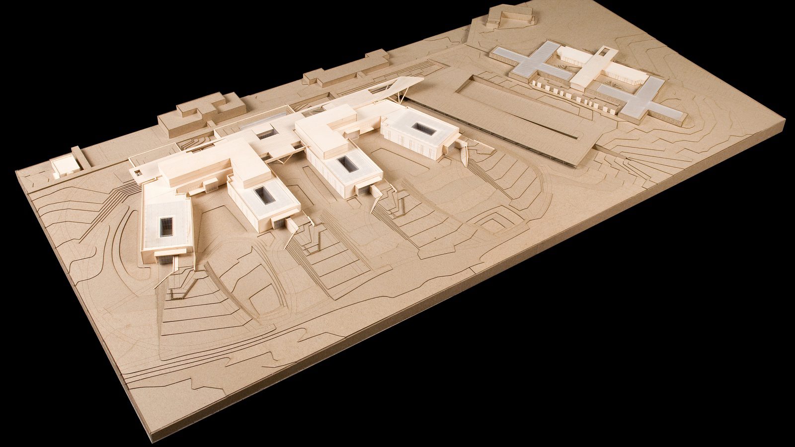 The design takes advantage of sloping topography to link two levels of inpatient floors with the landscape, environment and larger community. Wheelchair-bound patients move freely on an undulating ground plane that weaves together an array of intimate spaces, inside and outside, on both levels. Clinical programs and social areas wind between the abutting grades, and green roofs and intimate courtyard gardens offer tranquil moments for socializing. The gardens are designed so that plants are within reach, bringing the natural world to the patients. In this landscape and through skylights and large windows, the sky is ever-present.