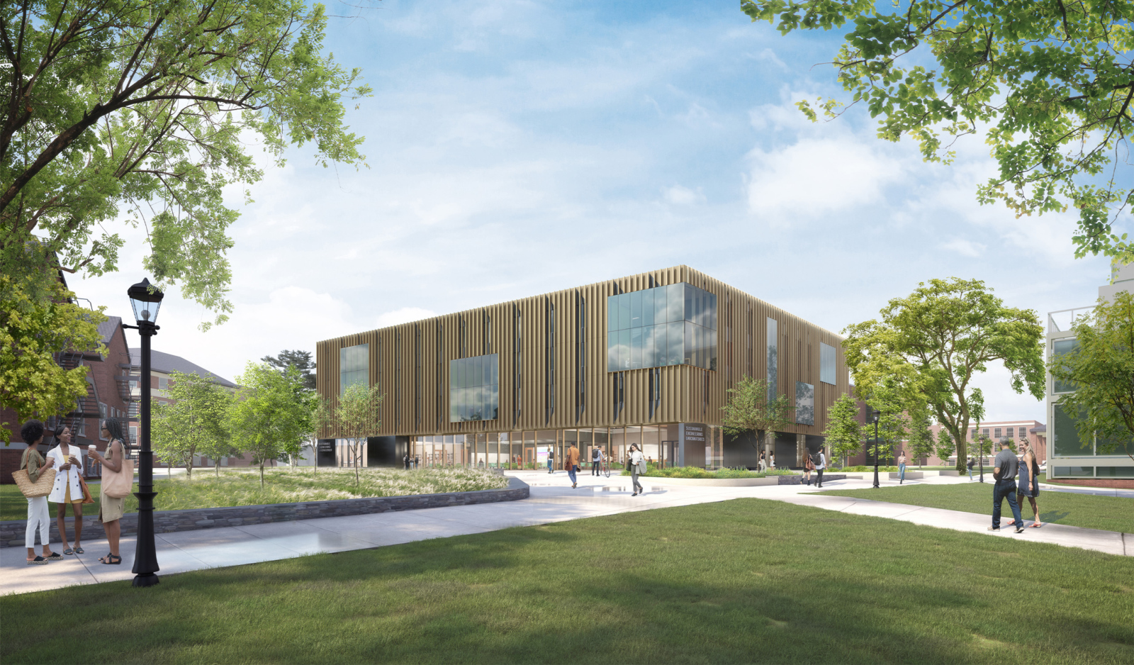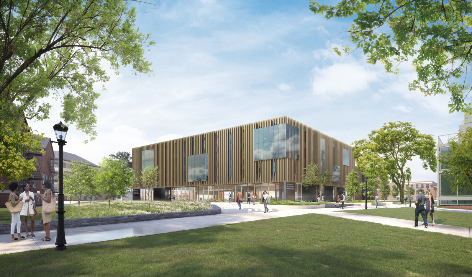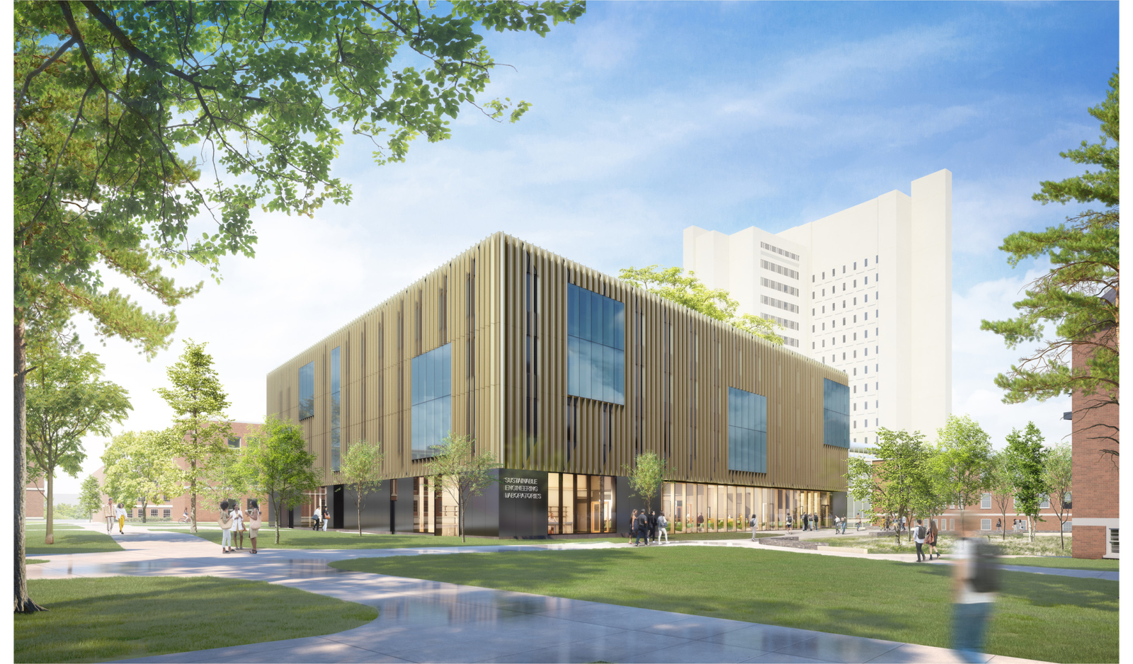 With the new Sustainable Engineering Laboratories (SEL), UMass Amherst is building a vibrant national hub to accelerate clean energy research and educate tomorrow’s sustainable engineering workforce. Instead of housing a single department, this living laboratory is a shared research hub for the entire College of Engineering; a hive for collaboration focused on sustainable initiatives. Situated on the southern edge of the Engineering campus, facing the Campus Center and Student Union, the SEL acts as the new ‘front door’ to Engineering for the broader campus.