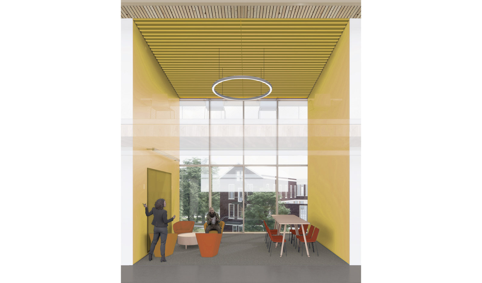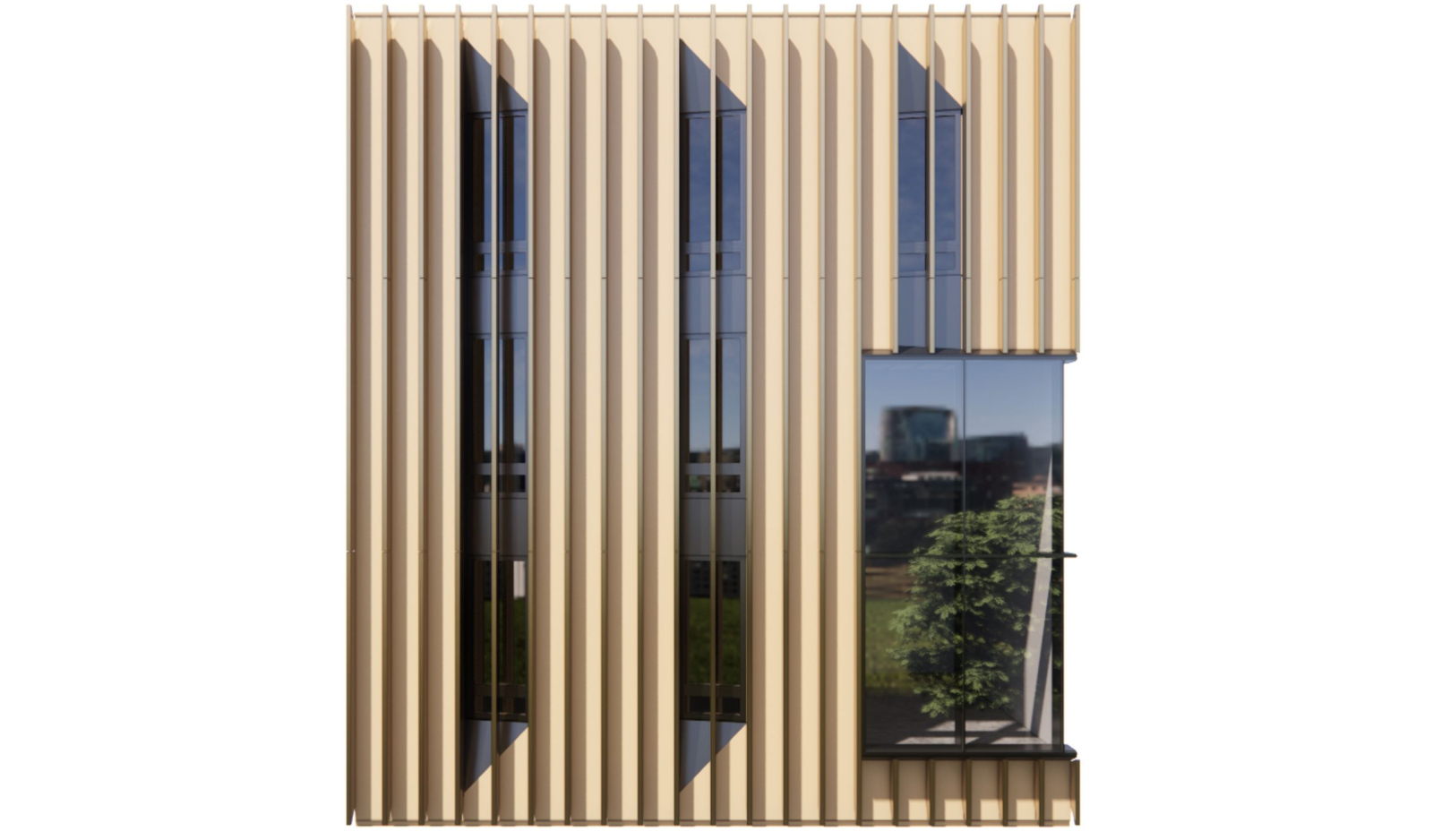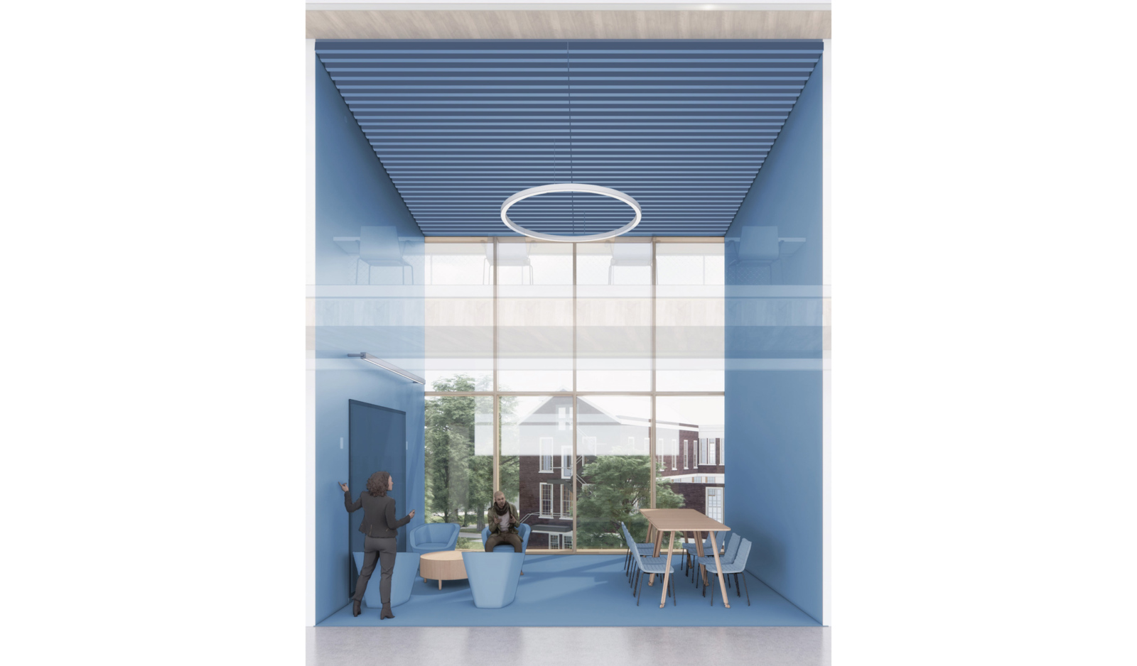 The building design reflects the ambitious charter of the SEL. As a ‘front door’ to the engineering school, the SEL invites the public into a transparent ground level, opening to the multiple approaches. At grade, the building hosts the broader UMass student body with classroom space, flexible commons space, and a café. The specialty research laboratories, (autonomous technology, ocean energy, battery technology, and energy operations) are strategically located at grade and on display in the public realm. The upper levels of the SEL host the research community. Imagined as a singular interior, the research programs (labs, offices, shared conference, etc.) are permeated with a series of multi-height commons spaces, allowing visual connections across the building and promoting collaboration. The primary façade identity is made up of a continuous unifying screen that provides tuned solar shading, yielding only where those interior commons spaces intersect the periphery of the plan, highlighting the variegated research community inside.